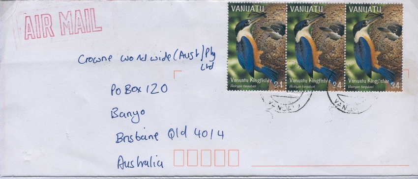 - Wie auf fast allen Inseln Ozeaniens hat sich eine starke „endemische“ (nur auf diesen Inseln vorkommende) Flora und Fauna gebildet . So gehört auch der Vanuatu-Eisvogel zu den selteneren Arten, die nur auf Vanuatu vorkommen. Brief aus der Hauptstadt Port Vila nach Australien