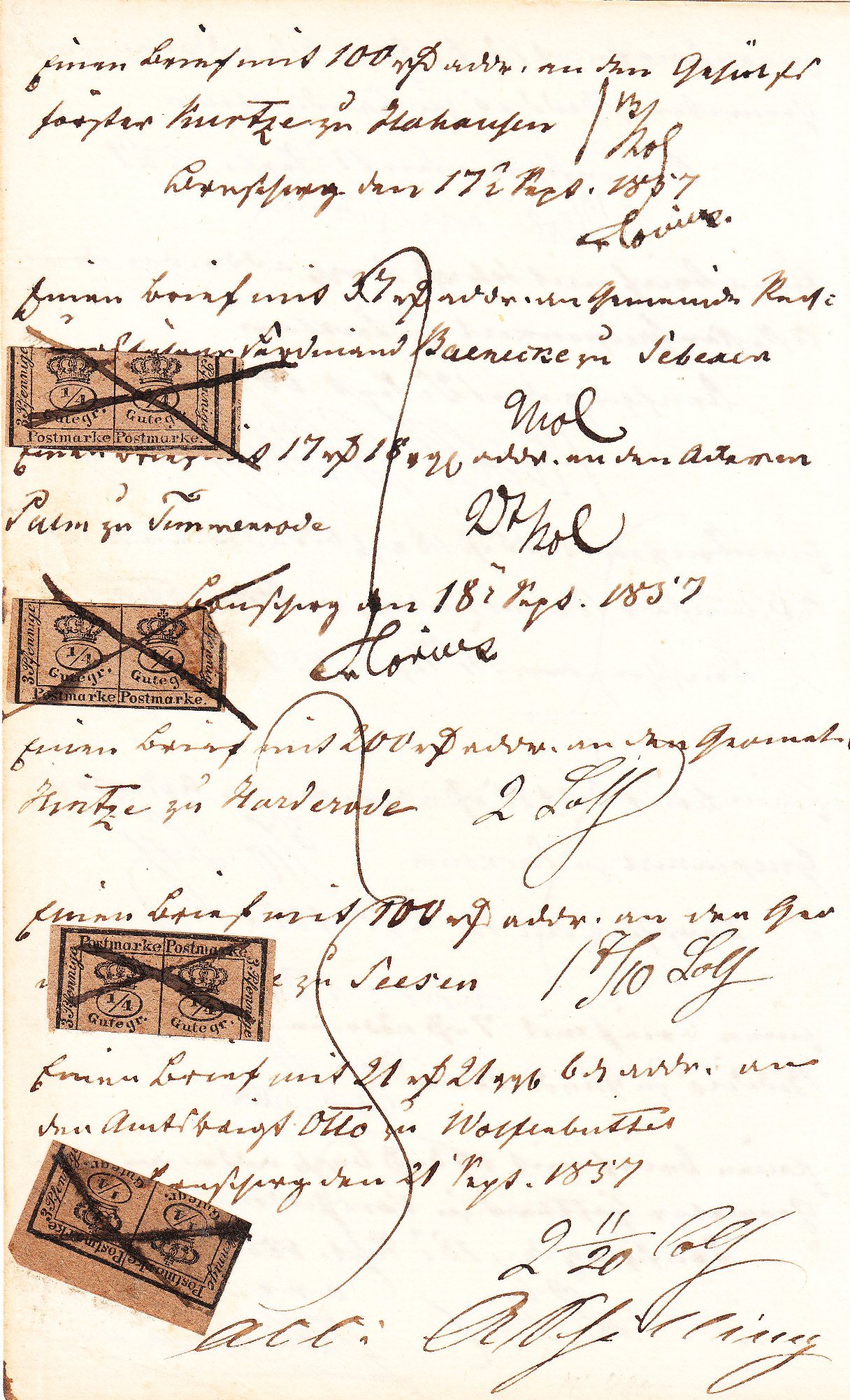Es handelt sich um eine Seite aus einem Posteinlieferungsbuch aus Braunschweig aus dem Jahre 1857, wobei viermal die Einlieferung von jeweils einem Brief mit Wertangabe quittiert wurde.