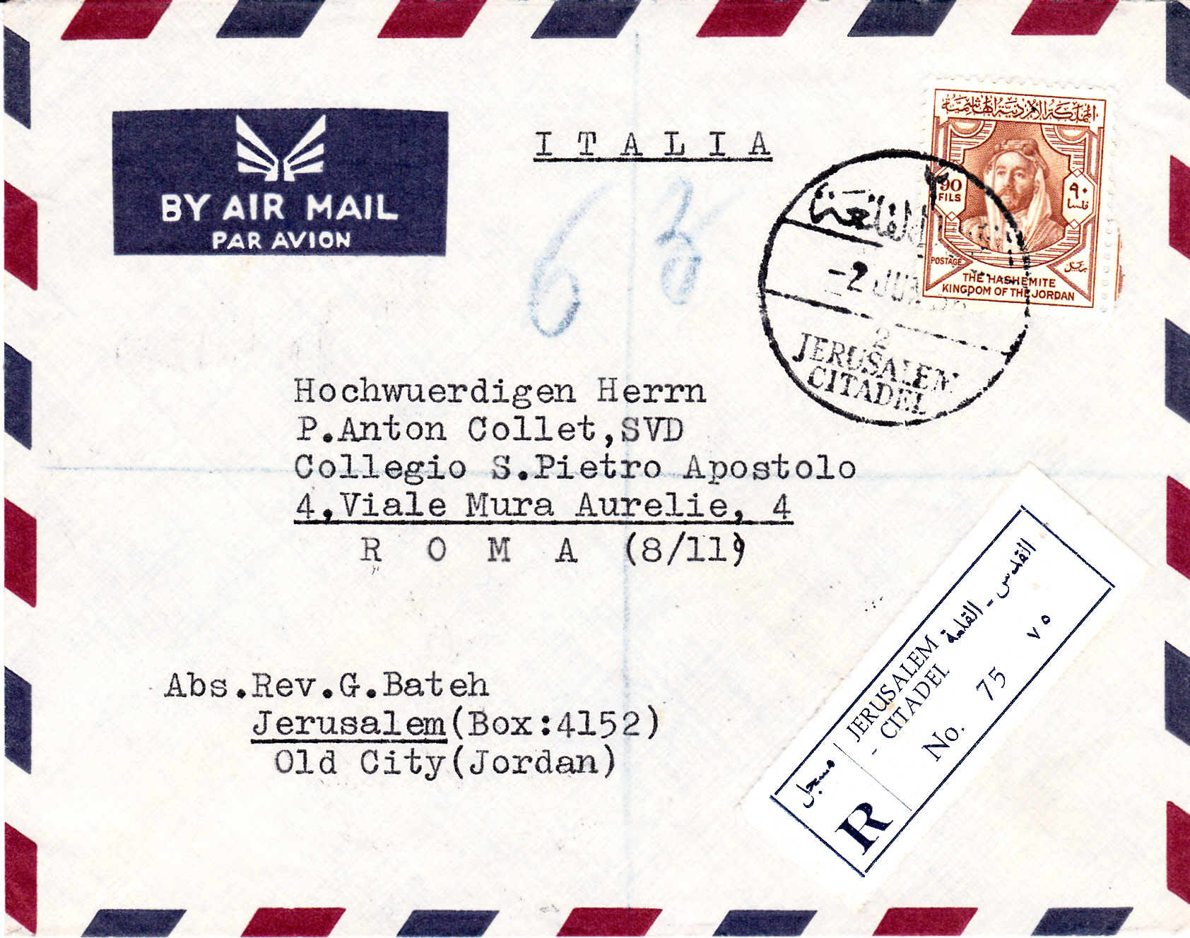 Luftpostbrief per Einschreiben von Jerusalem Citadel nach Rom. Der Ostjerusalem mit der Altstadt Jerusalems sowie das Westjordanland gehörten in dieser Zeit bis zum Sechstagekrieg vom Juni 1967 zu Jordanien. Zur Frankatur wurde eine Marke aus der Freimarkenserie König Abd Allah Ibn al-Husain zum 90 Fils (MiNr 257) benutzt.