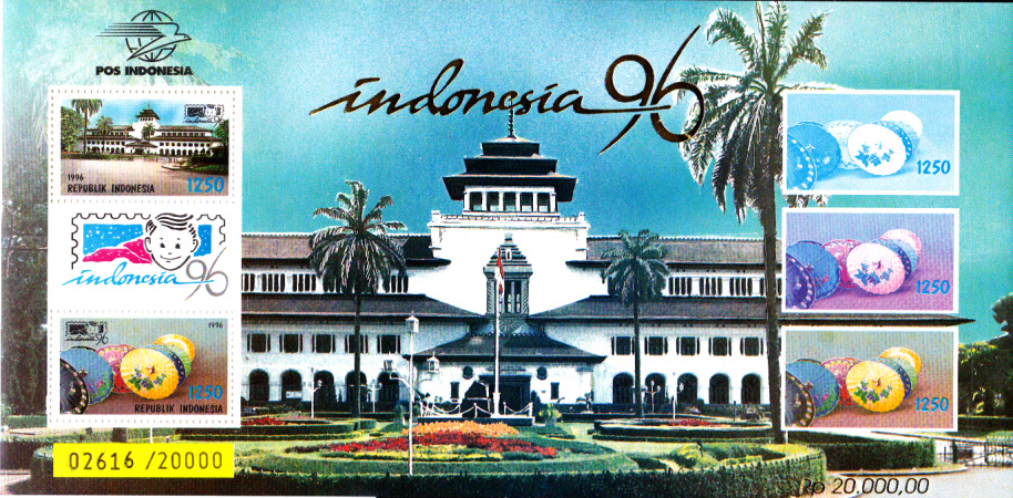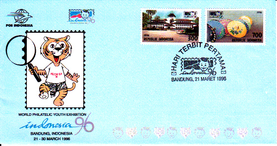 Zur Internationalen Briefmarkenausstellung der Jugend INDONESIA ’96 in Bandung erschienen am Eröffnungstag der Ausstellung am 21. März 1996 zwei Sondermarken (MiNr Indonesien 1606/7), die ich hier auf einem FDC der indonesischen Post zeige.