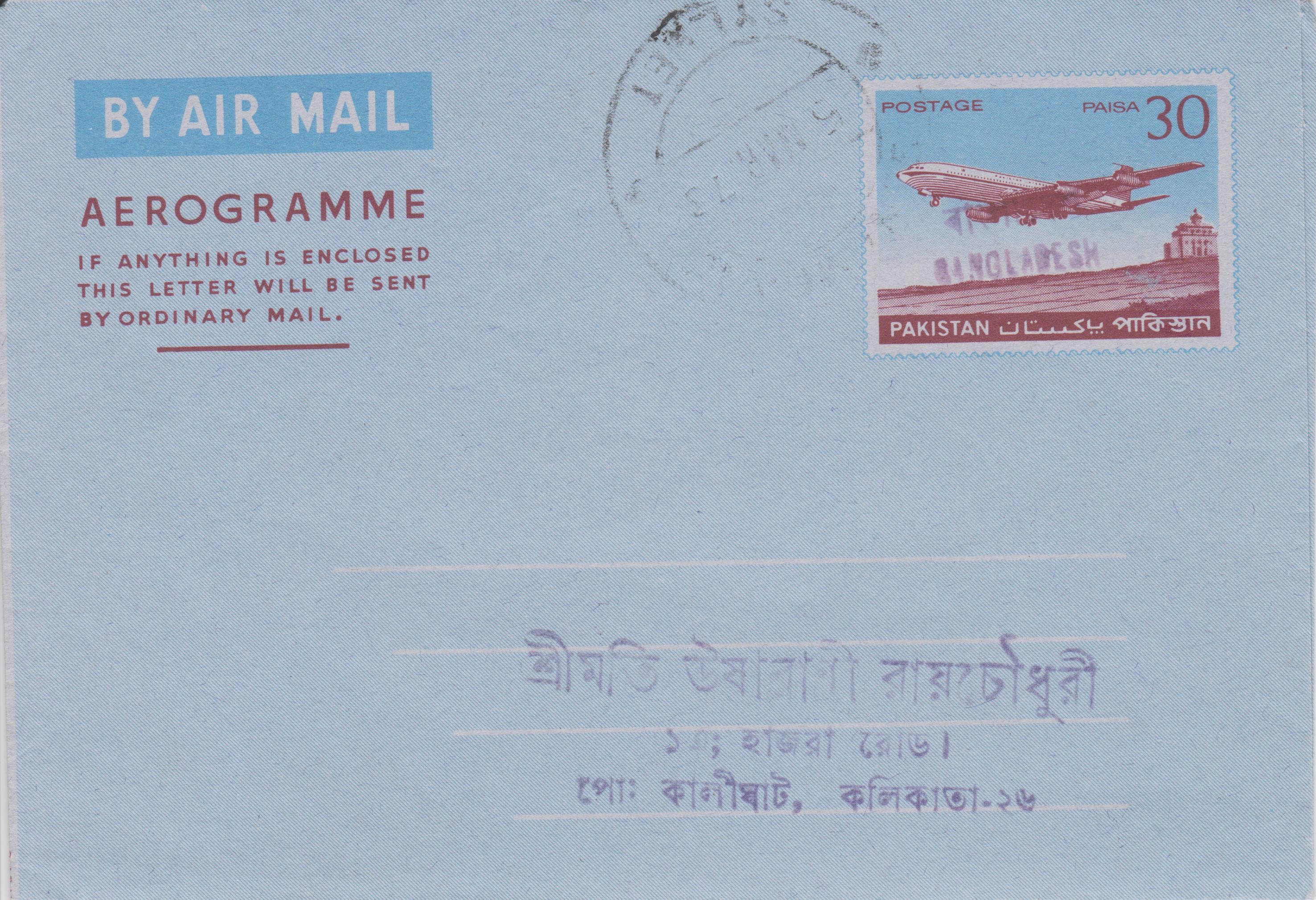1973 echt gelaufenes Aerogramm aus PAKISTAN mit Aufdruck BANGLADESH: