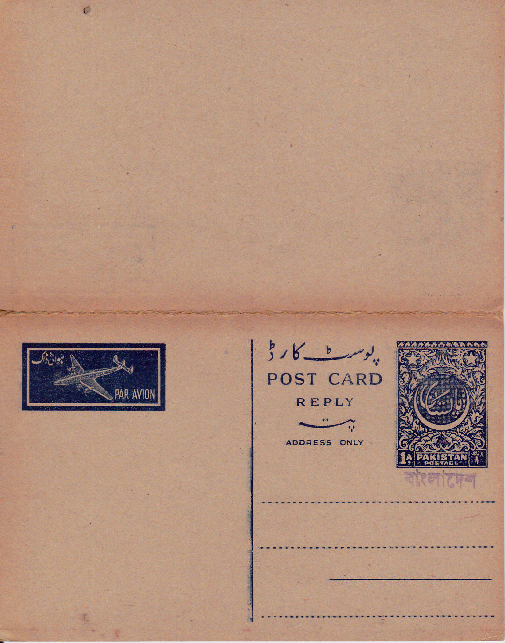 Luftpost-Postkarte mit Antwortkarte mit Werteindruck 1 Anna aus Pakistan mit einem weiteren und etwas größerem Handstempelaufdruck im Typ C: Aufdruck nur in Bengali in violett.