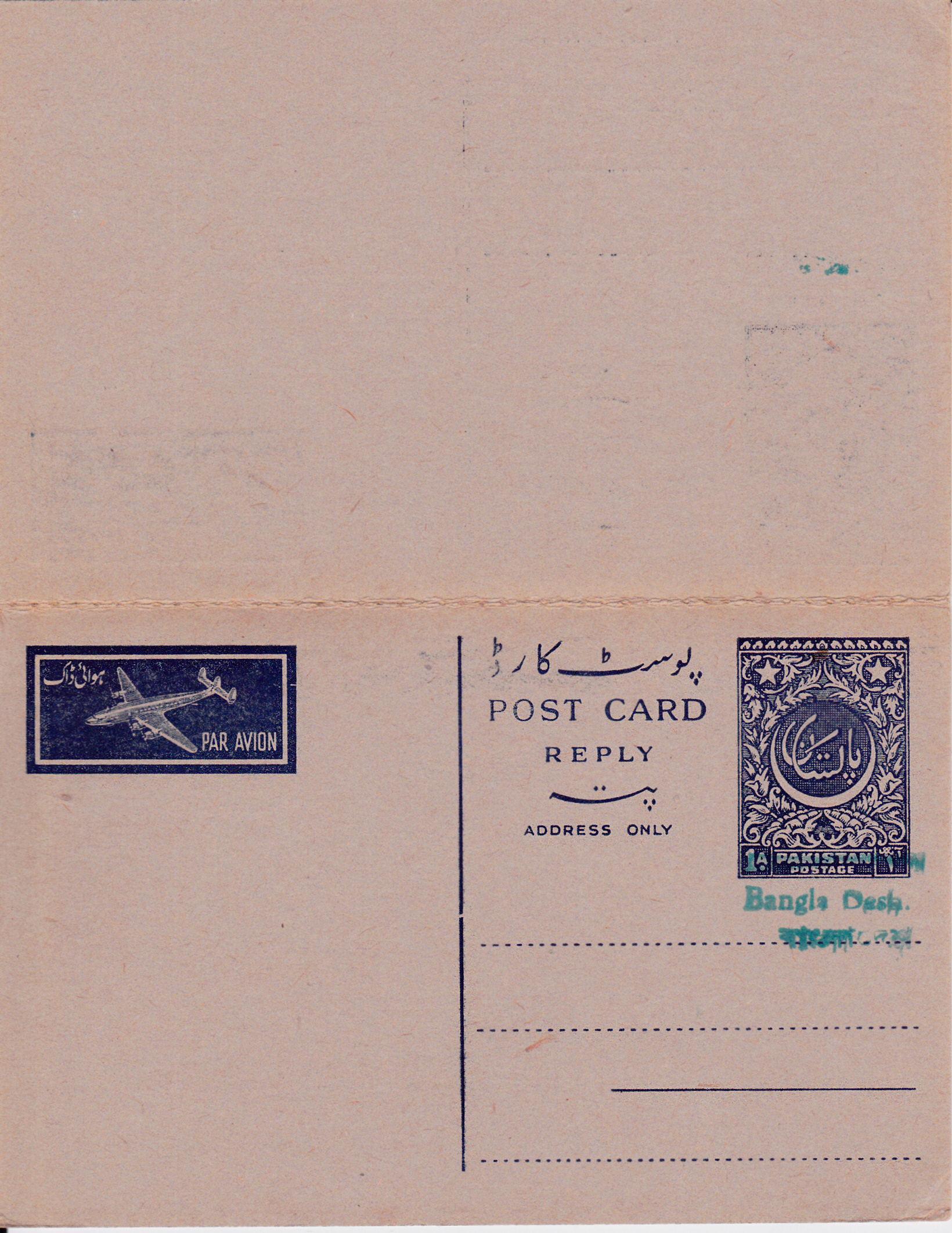 Luftpost-Postkarte mit Antwortkarte mit Werteindruck 1 Anna aus Pakistan mit Handstempelaufdruck im Typ G: Aufdruck zweisprachig, oben in Englisch (Groß- und Kleinbuchstaben), unten in Bengali in grün. Pakistan ist überbalkt.