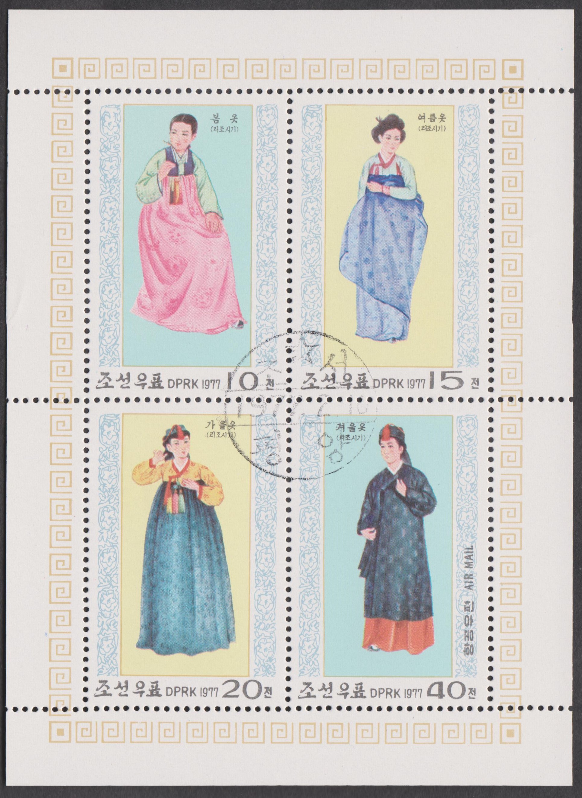 Nordkorea MiNr. 1600 - 1603 erschienen zum Thema Nationaltrachten und zeigen Fauengewänder aus dem 18. und 19. Jahrhundert: