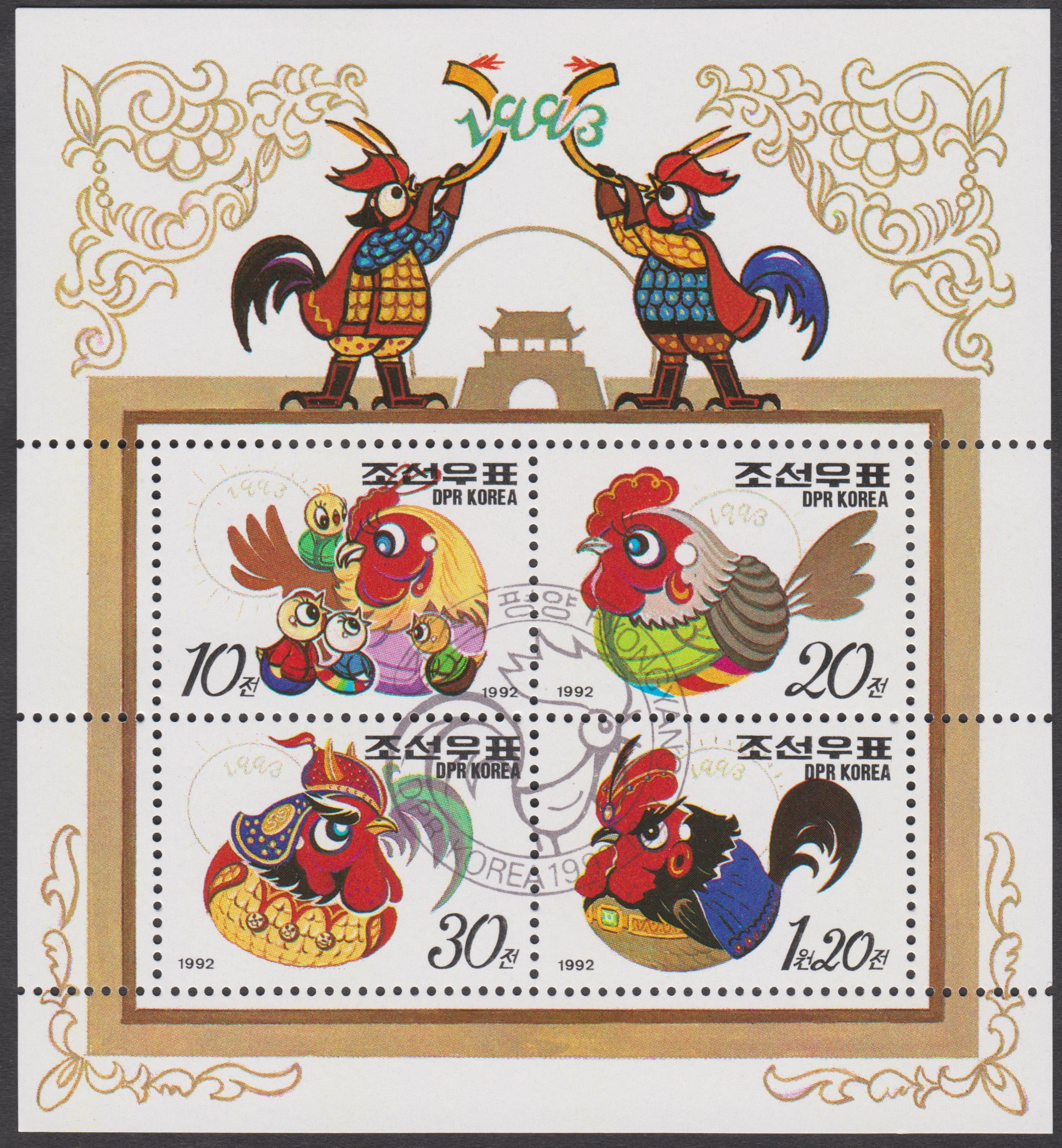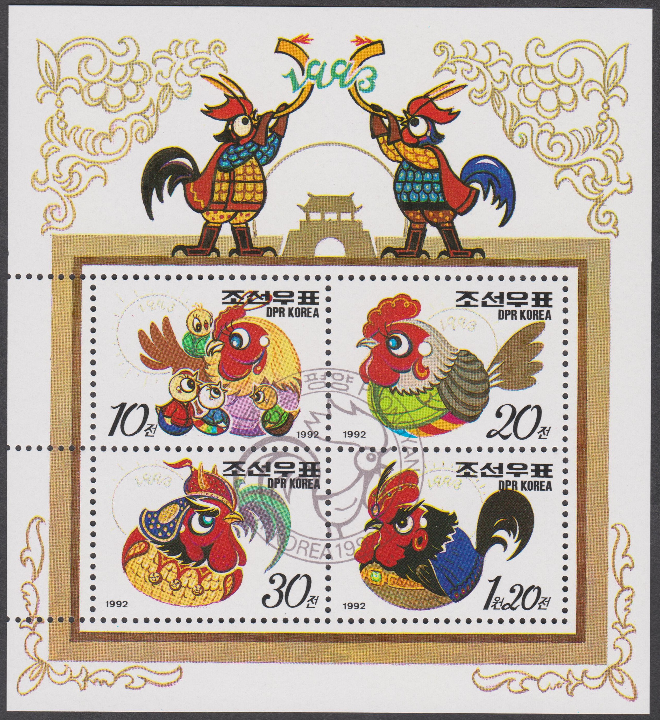 Nordkorea MiNr. 3360 - 3362 sowie 3366 erschienen zum Thema Jahr des Hahnes zusammenhängend im Kleinbogen: