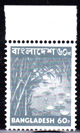 Wert zu 60 Paisa der Dauerserie 1976 (MiNr 64) Bambus und Wasserlilien im kleinen Format als Oberrandstück. Ausgabetag war der 10. November 1976.