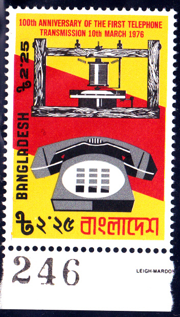 Am 10-März 1976 erschien zum Thema "1oo Jahre Telefon" eine Markenausgabe mit zwei Werten. Der Wert zu 2,25 Take bildet das erste Telefon und ein modernes Telefon ab, der zweite Wert zu 5 Taka zeigt ein Porträt von Alexander Graham Bell (1847 bis 1922), der als erster Mensch aus der Erfindung des Telefons Kapital geschlagen hat, indem er Ideen seiner Vorgänger zur Marktreife weiterentwickelte.