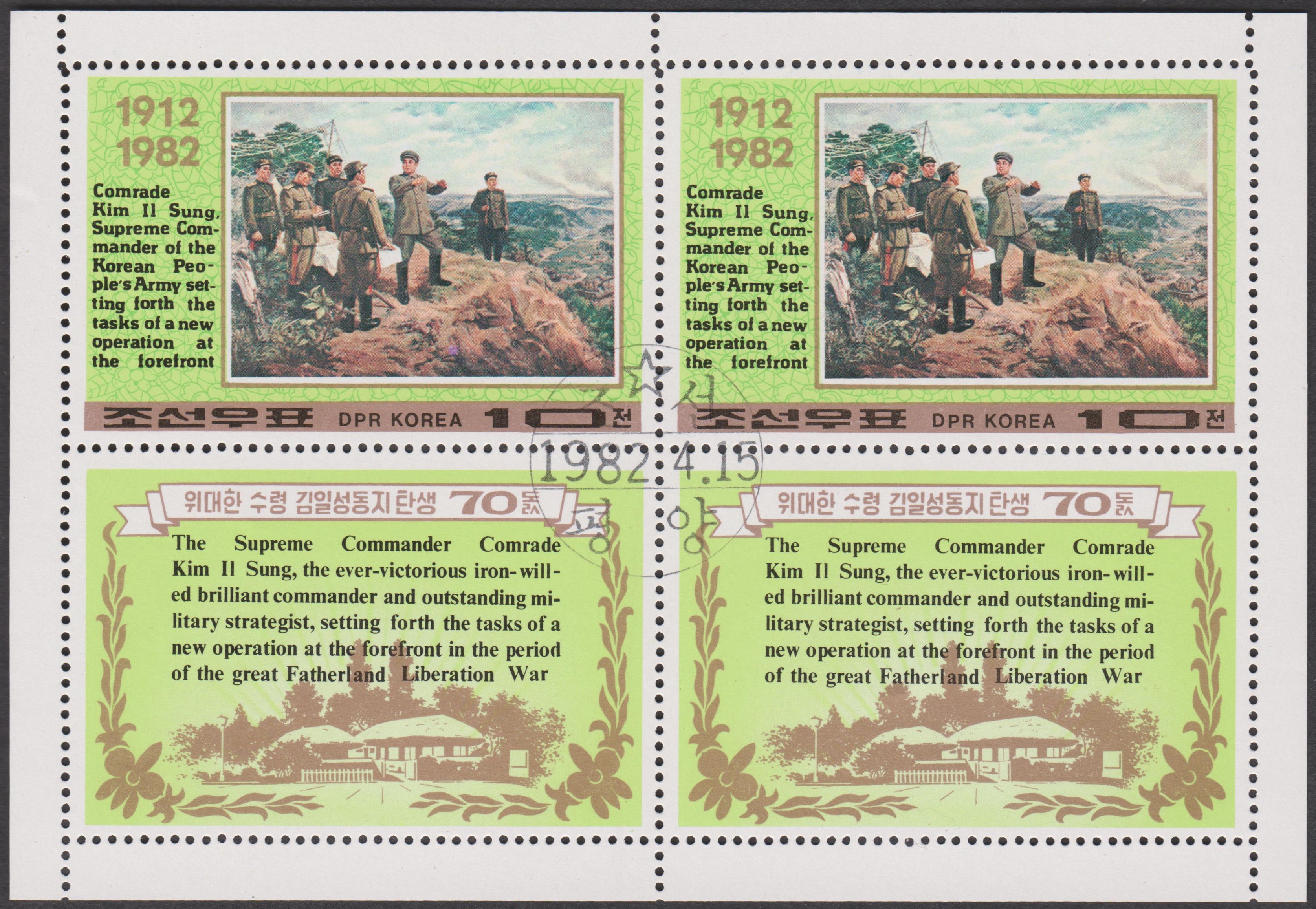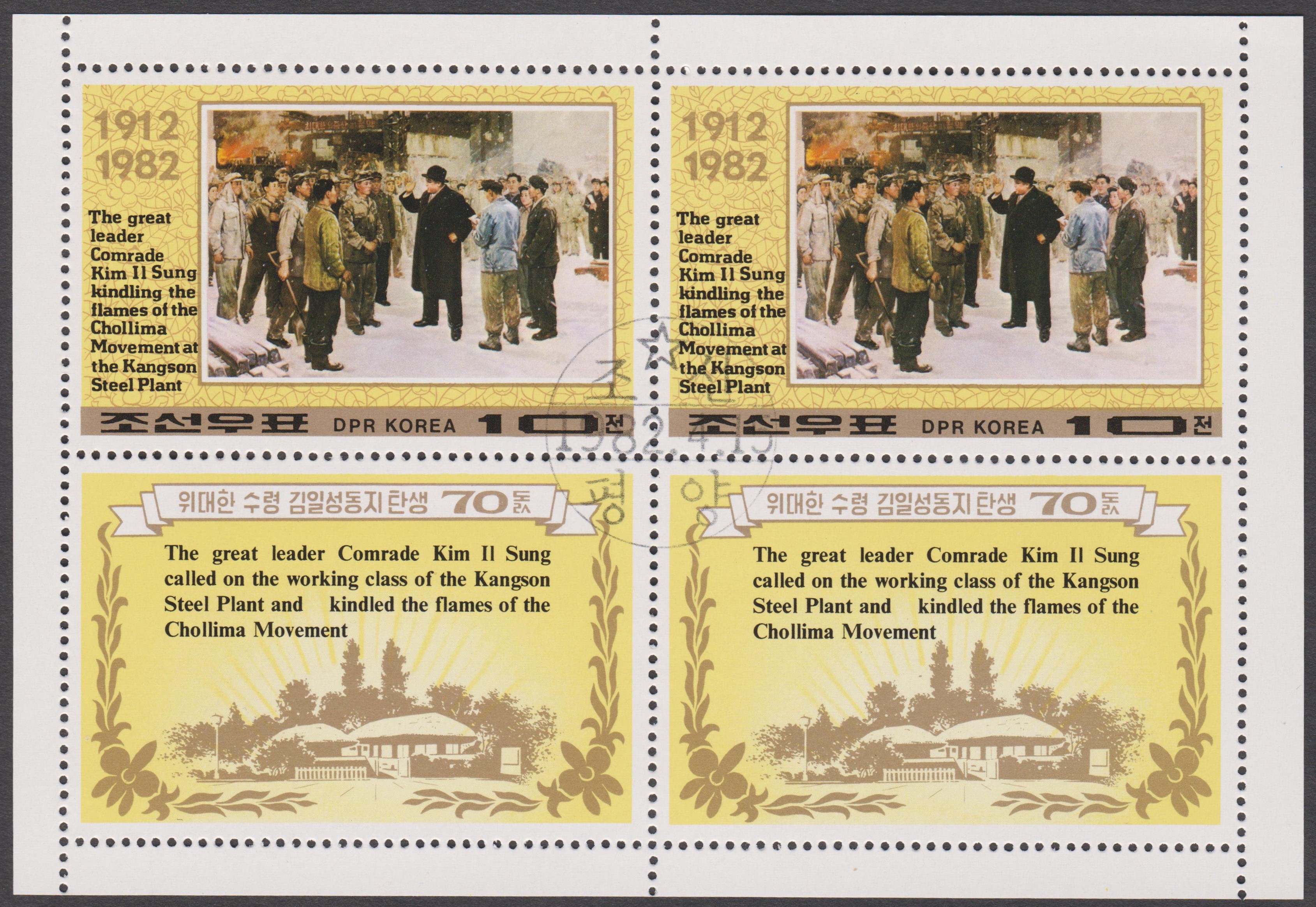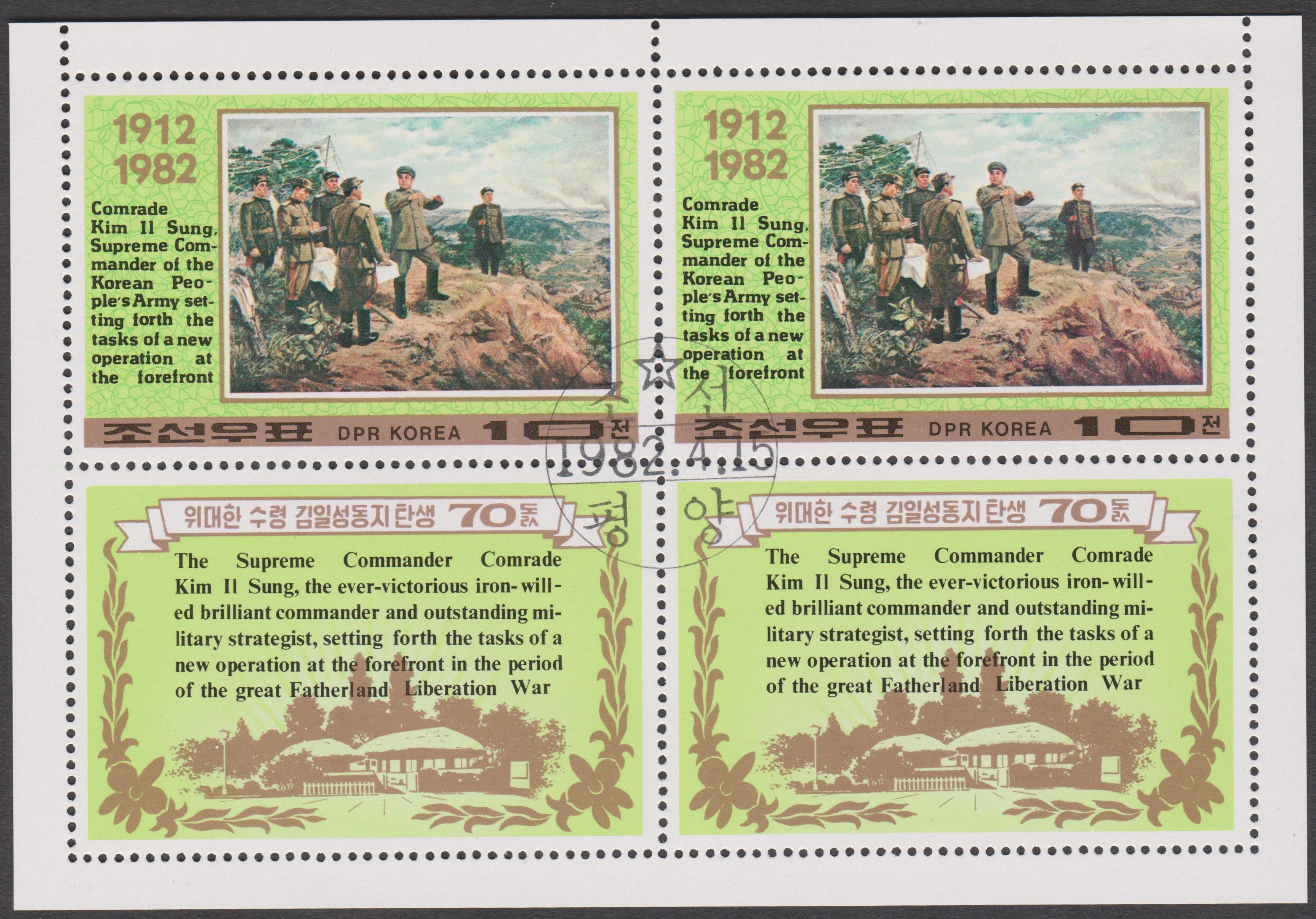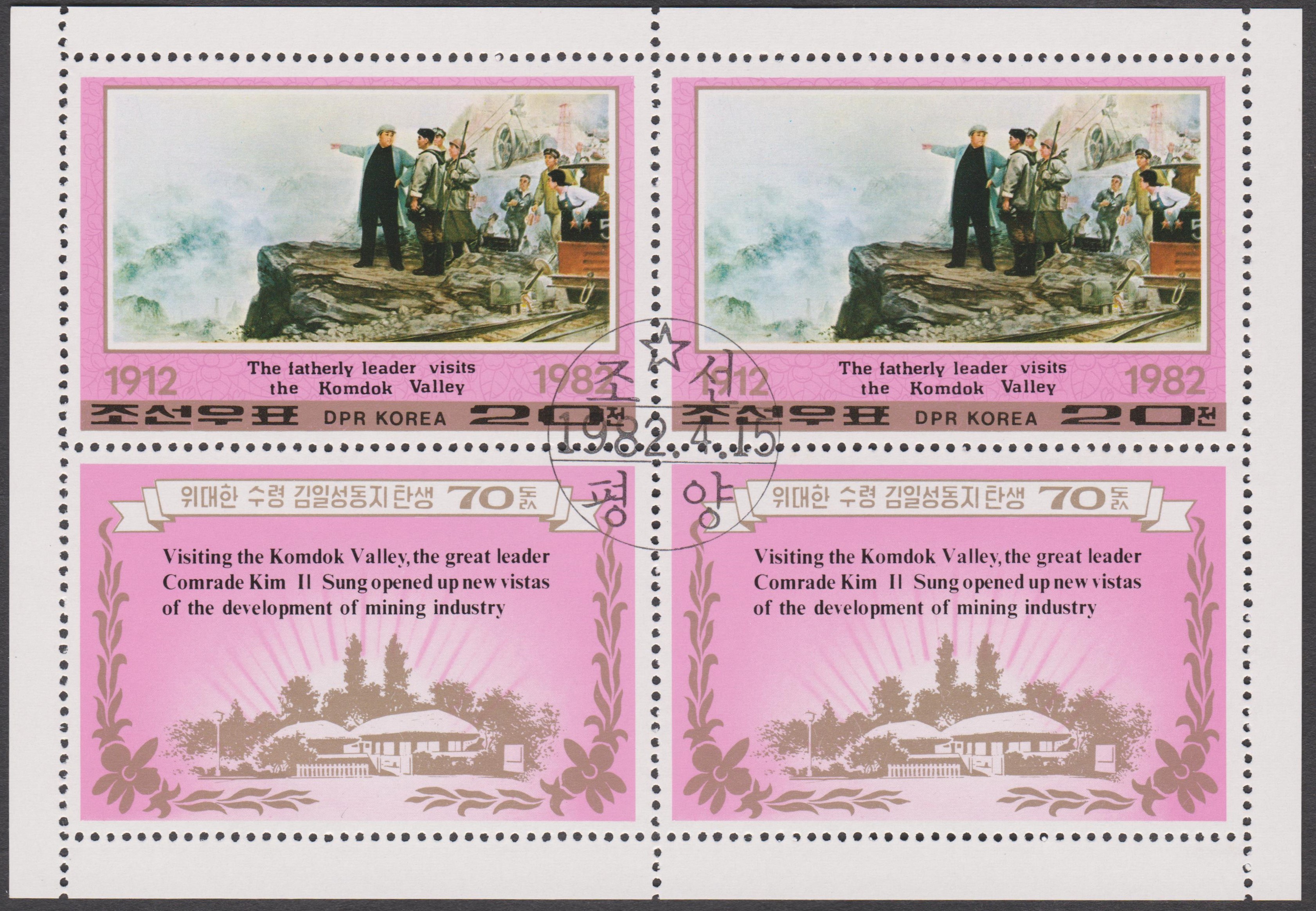 Nordkorea MiNr. 2210 erschien zum 70. Geburtstag von Präsident KIM IL SUNG und zeigt ihn beim Besuch des Komdok-Tals: