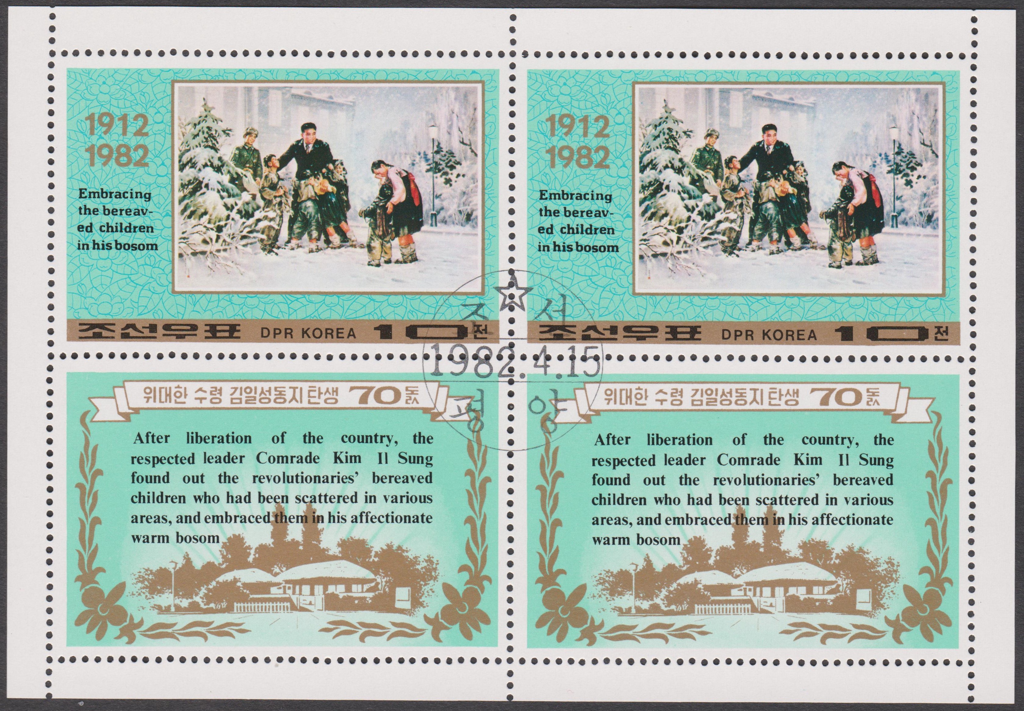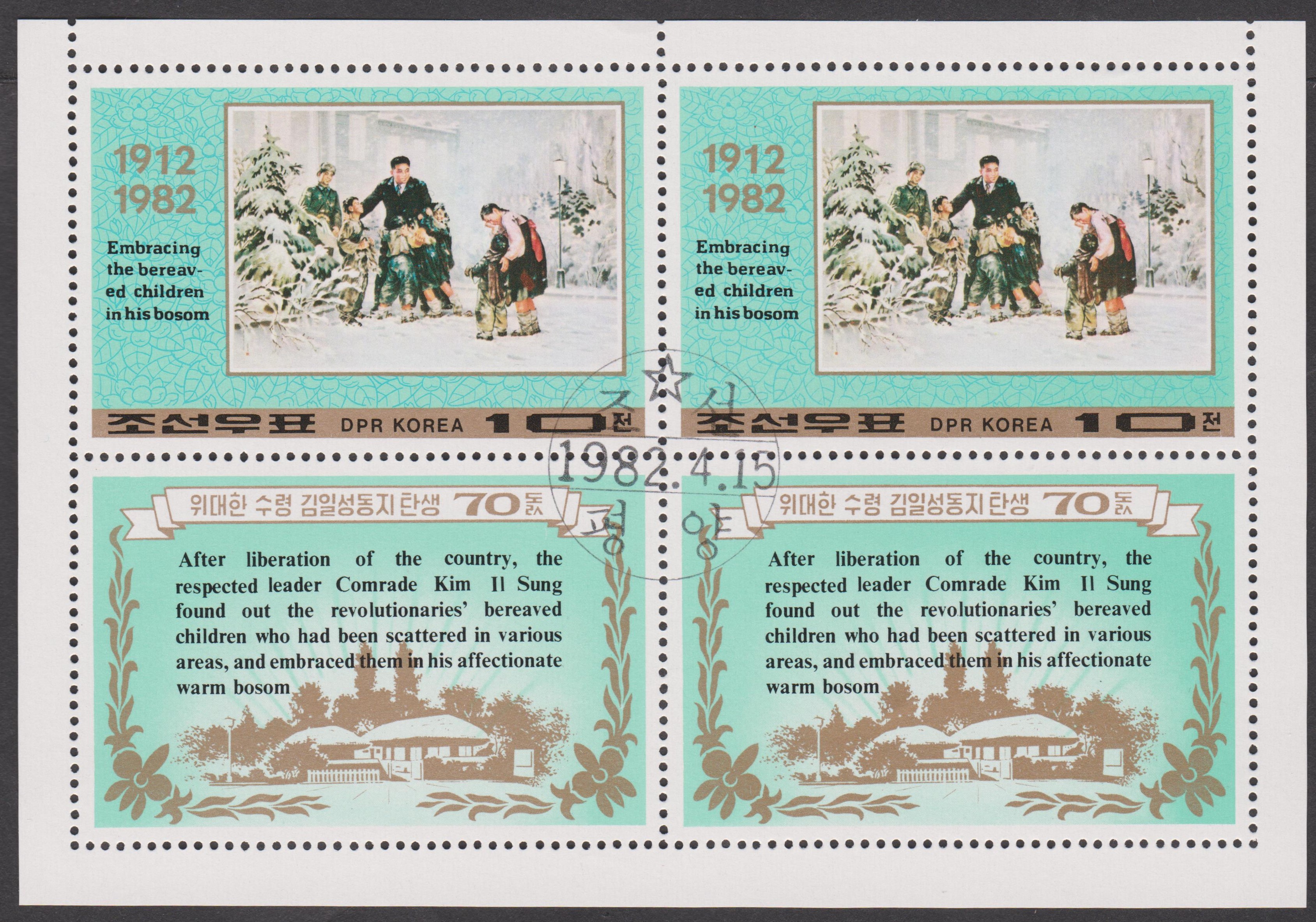 Nordkorea MiNr. 2204 erschien zum 70. Geburtstag von Präsident KIM IL SUNG und zeigt ihn, als er Waisenkinder umarmt: