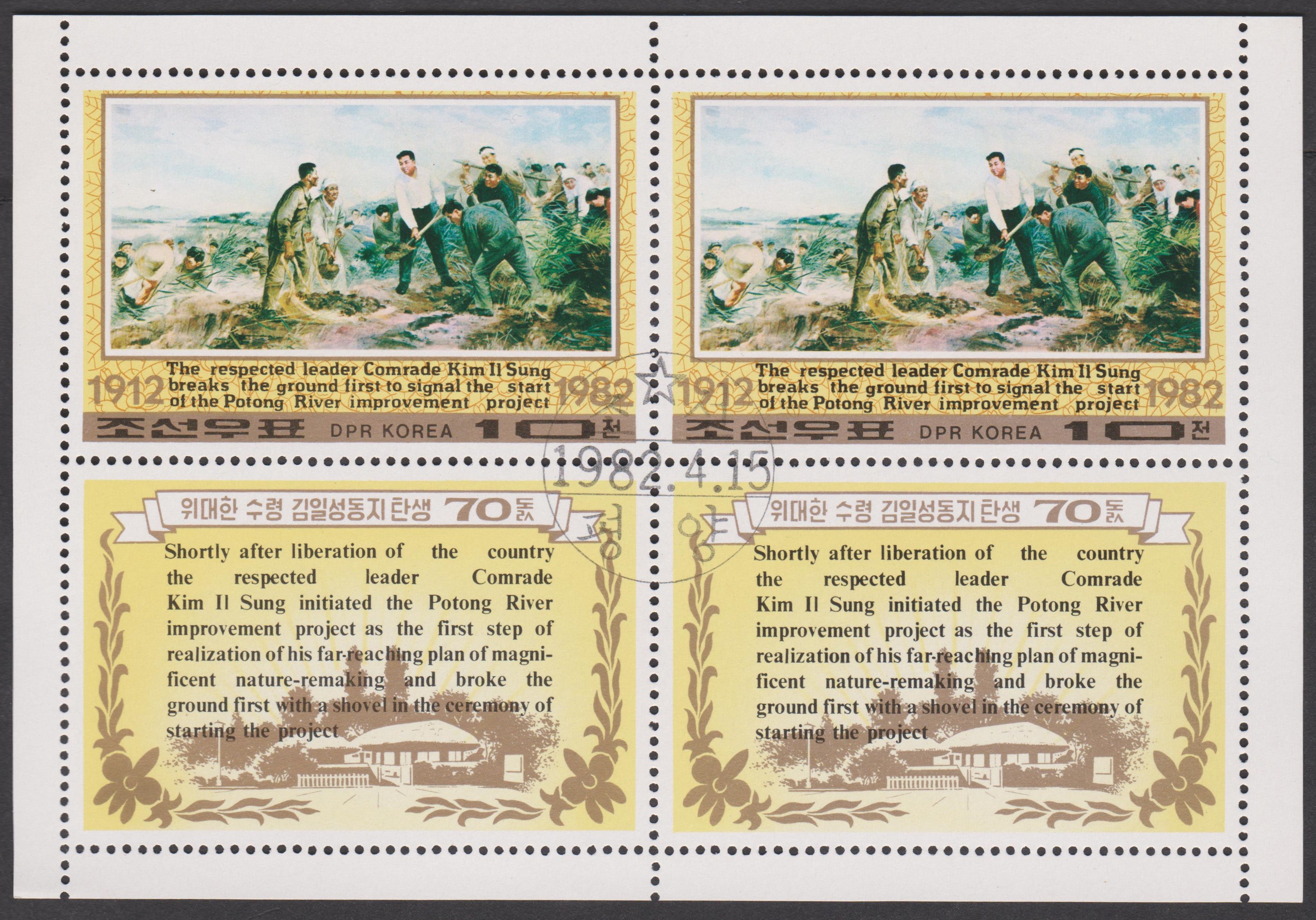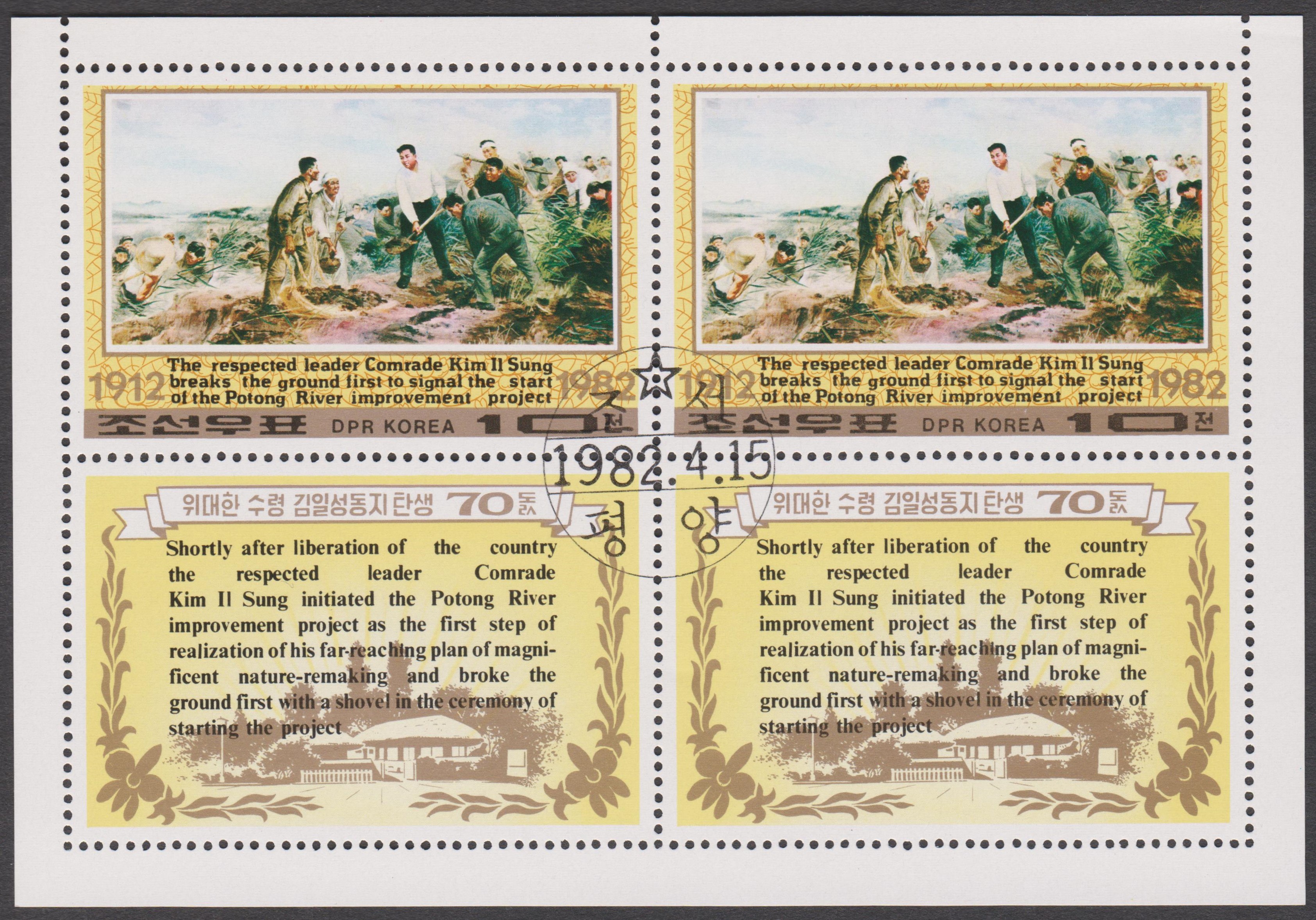 Nordkorea MiNr. 2203 erschien zum 70. Geburtstag von Präsident KIM IL SUNG und zeigt ihn beim ersten Spatenstich zur Regulierung des Potong-Flusses: