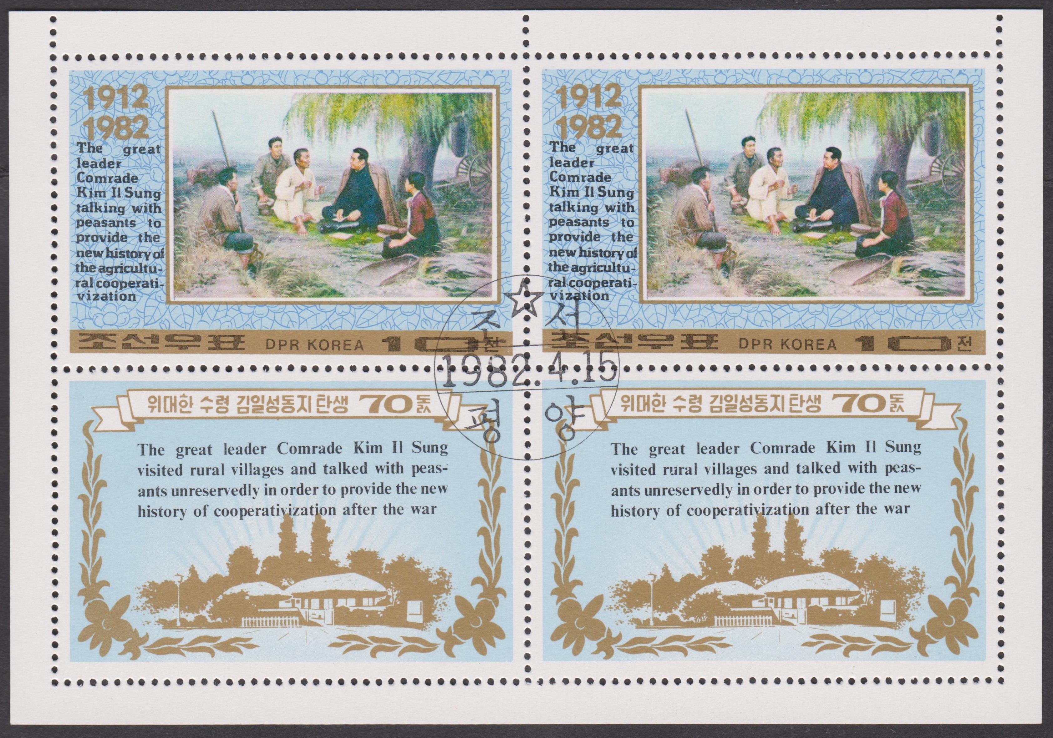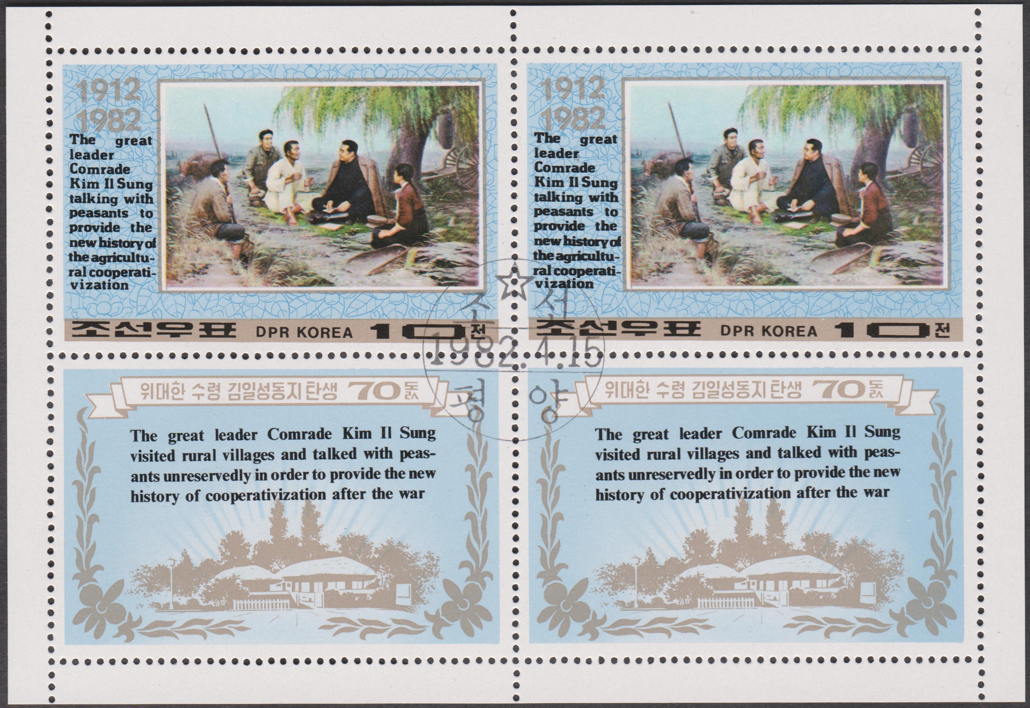 Nordkorea MiNr. 2208 erschien zum 70. Geburtstag von Präsident KIM IL SUNG und zeigt ihn im Gespräch mit Bauern:
