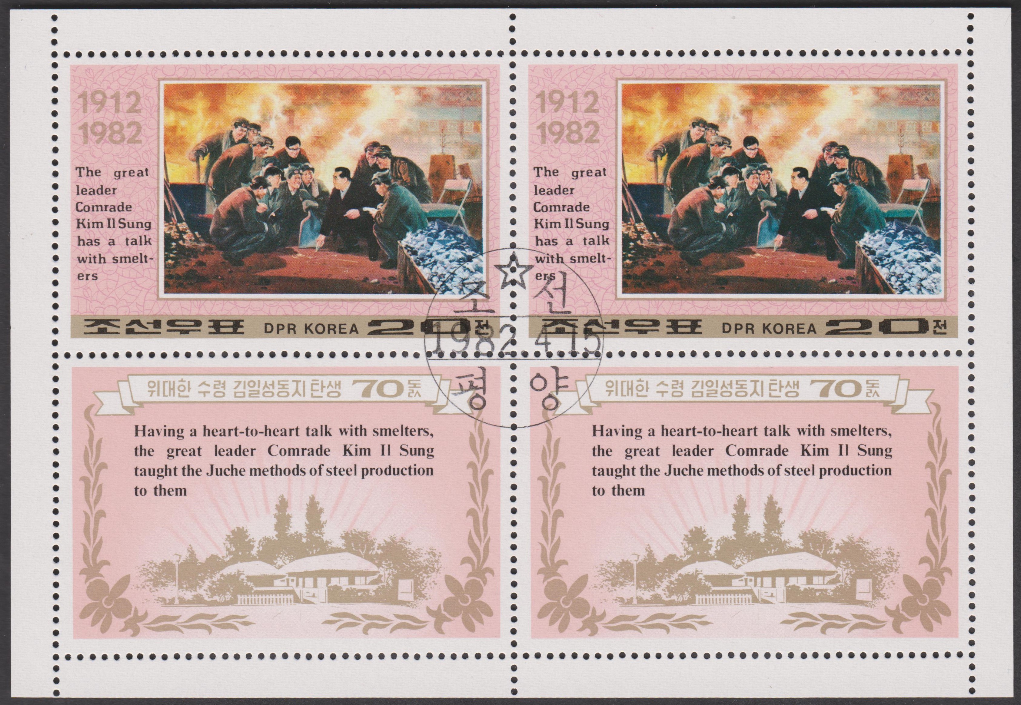 Nordkorea MiNr. 2213 erschien zum 70. Geburtstag von Präsident KIM IL SUNG und zeigt ihn in einem Stahlwerk: