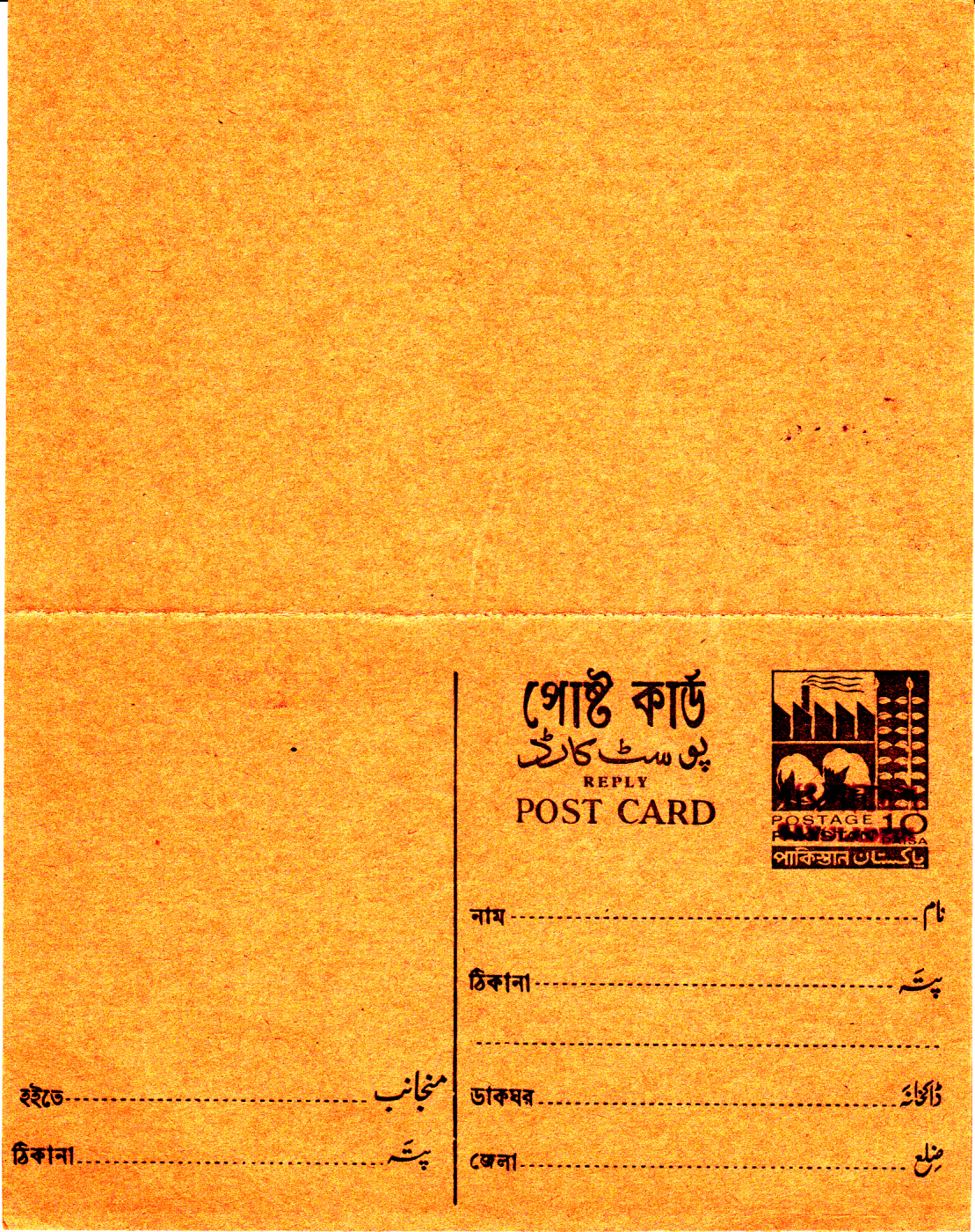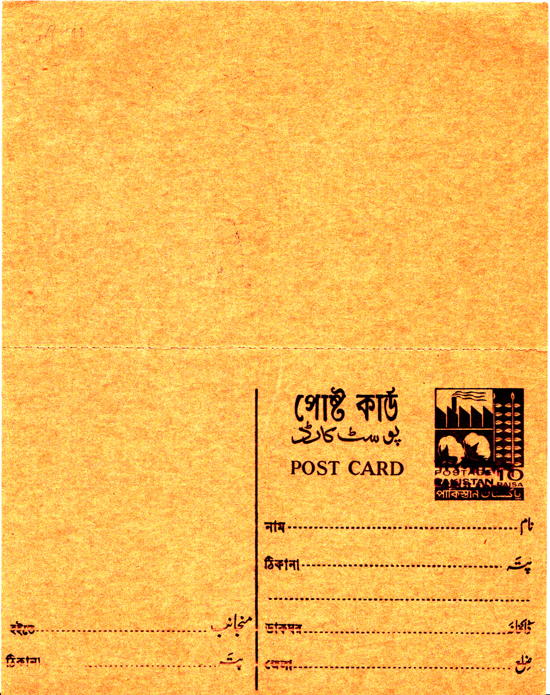 Auch Postkarten aus Pakistan erhielten Handstempelaufdrucke. Hier eine Postkarte zu 10 Paisa mit einem Handstempel Typ E.