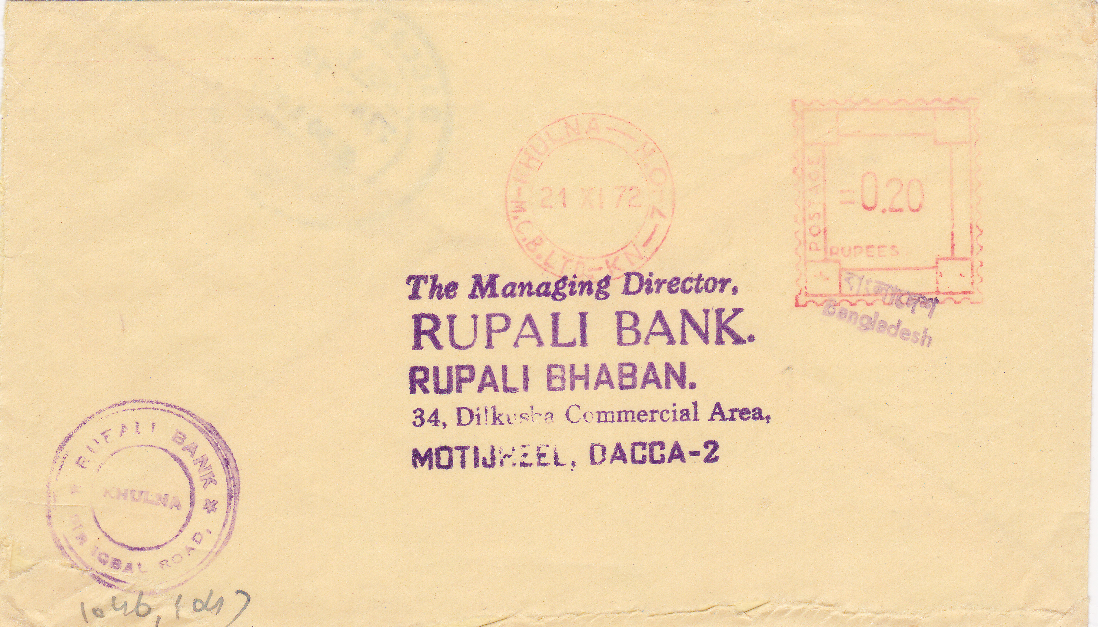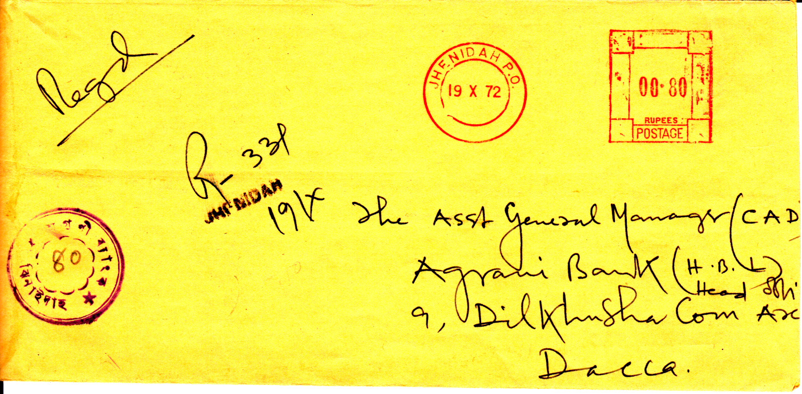Bei vorhandenen Freistempelmaschinen wurde nach Ende des Befreiungskrieges im Wertstempel der Landesname "Pakistan" aptiert, wie dieses Beispiel vom Jhenidah P.O zeigt. Der Brief wurde als Einschreiben am 19.10.1972 nach Dacca verschickt, wo er 23.10.1972 (rückseitiger Ankunftsstempel) eintraf.