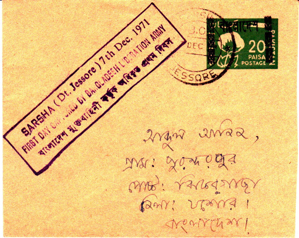 Ganzsachenumschlag Pakistan mit Maschinen- Aufdruck Bangladesch in Bengali. Der Zusatzstempel "SARSHA (Dt. Jessore 7TH Dec. 1971 FIRST DAY CAPTURED BY BANGLADESH LIBERATION ARMY" dokumentiert die Einnahme der Stadt am 7.12.1971 durch die Befreiungsarmee.