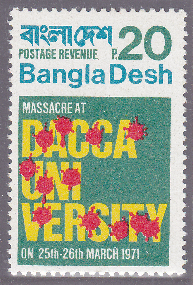 An der Universität von Dacca kam es vom 25. auf 26. März 1971 zu einem blutigen Massaker. Daraufhin wurde am 26. März 1971 die Republik Bangladesch durch die Befreiungsarmee ausgerufen. Der Wert zu 20 Paisa (MiNr 2) erinnert an das Blutbad der Pakistaner in der Dacca Universität vom 25./26. März 1971.