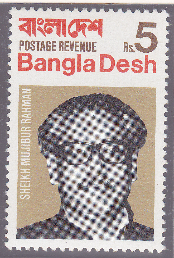 Die Marke zu 5 Rupien (MiNr 7) zeigt ein Porträt von Sheikh Mujibur Rahman, dem Führer der Awami-Liga und ersten Präsidenten von Bangladesch.