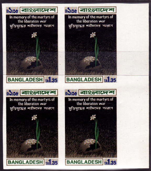 Auch den Wert zu 1,35 Taka (MiNr 21) gibt es als geschnittene Abart, hier im Viererblock vom rechten Bogenrand.