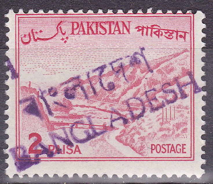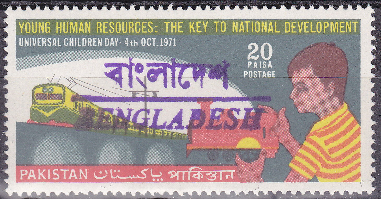 Nach Beendigung des Bangladesch-Krieges am 16.12.1971 dauerte es nur 1 Woche bis zur Wiederaufnahme des Postdienstes ins Ausland. Aus Anlass des ersten Austausches von Postsendungen zwischen dem neuen Staat Bangladesch und Indien wurden zwei Sondermarken Pakistans mit einem Buchdruck-Überdruck in englisch und bengali versehen. Dies waren die 20 Paisa Marke zum Tag des Kindes vom 4. Oktober 1971 und der 20 Paisa Wert aus Anlass der Hockey Weltmeisterschaft in Spanien vom 24.Oktober 1971.