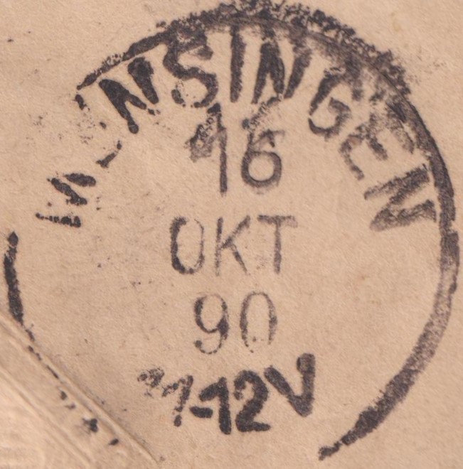 Ganzsachenumschlag mit gedruckter Adresse "Die K. Staatsanwaltschaft Ulm", aufgegeben am 15.10.1890 ULM BAHNHOF, gelaufen nach MÜNSINGEN: