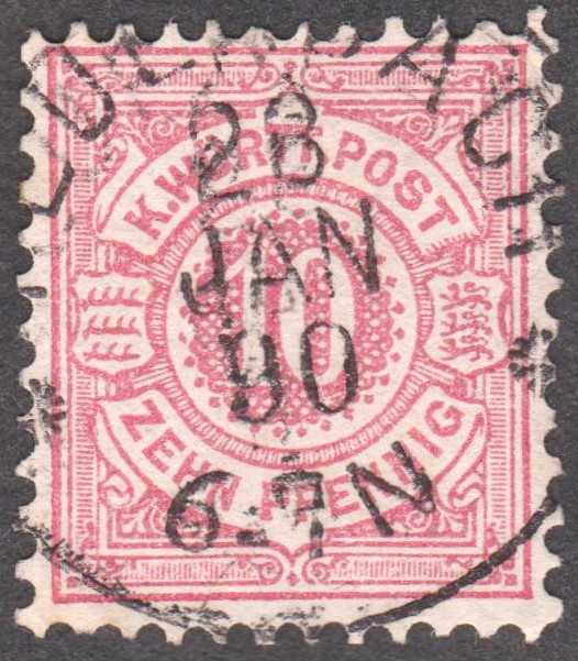 Freimarke 10 PFENNIG "Weiße Ziffern im Kreis", Württemberg MiNr. 46 b, mit Tagesstempel vom 28.01.1890: