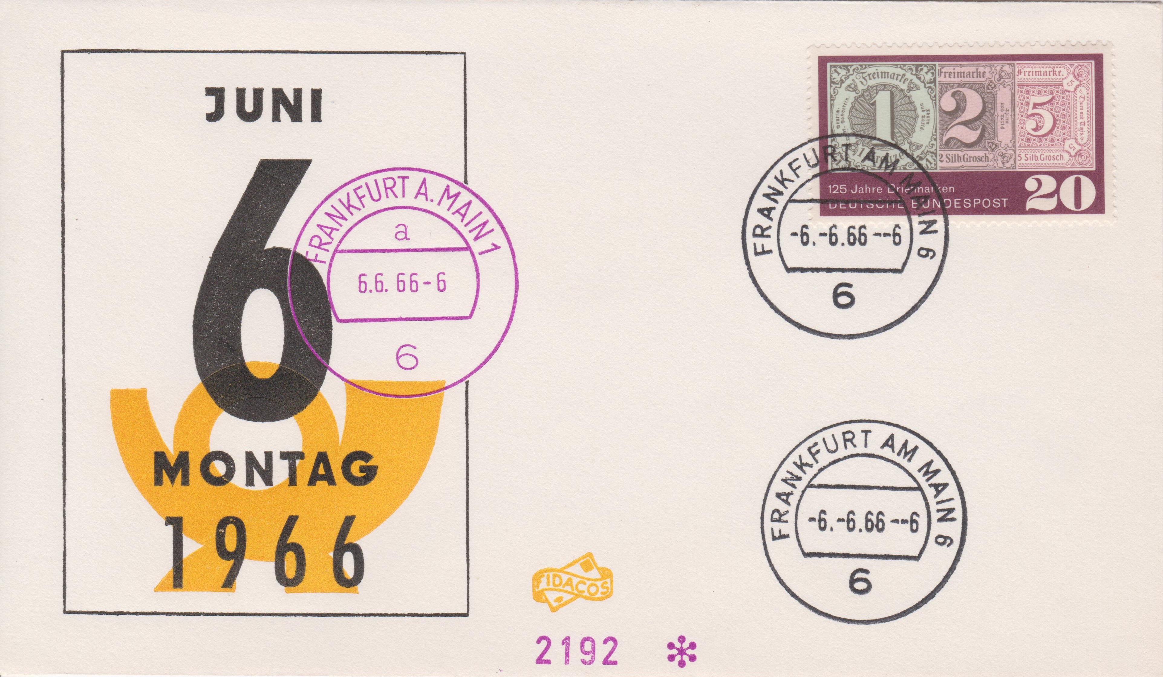 Bund MiNr. 482 zeigt die Postwertzeichen Thurn & Taxis MiNr. 5, 7 und 18, hier mit Tagesstempel 6 FRANKFURT AM MAIN 6 vom 6.6.66: