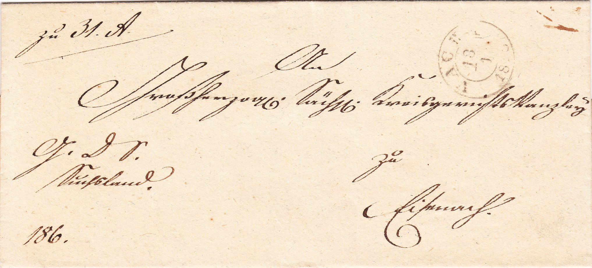 Dieser Brief lief als portofreie Dienstsache innerhalb des von der Thurn und Taxisschen Post bedienten Großherzogtums Sachsen-Weimar-Eisenach von "VACHA", wo an einem 13.01. ein Zweikreisstempel, katalogisiert bei FEUSER als "3661-4", abgeschlagen wurde, "An Großherzogl. Sächs. Kreisgerichtskanzley zu Eisenach", wo rückseitig noch am selbigen 13.01. um "7-8 N" ein Zweikreisstempel als Ankunftsstempel abgeschlagen wurde:
