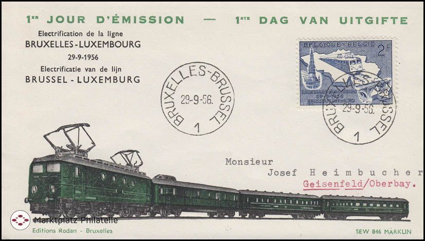 Sie zeigt eine Lokomotive in einer besonderen Darstellung der belgischen Landkarte u. auch Luxemburg. Meine