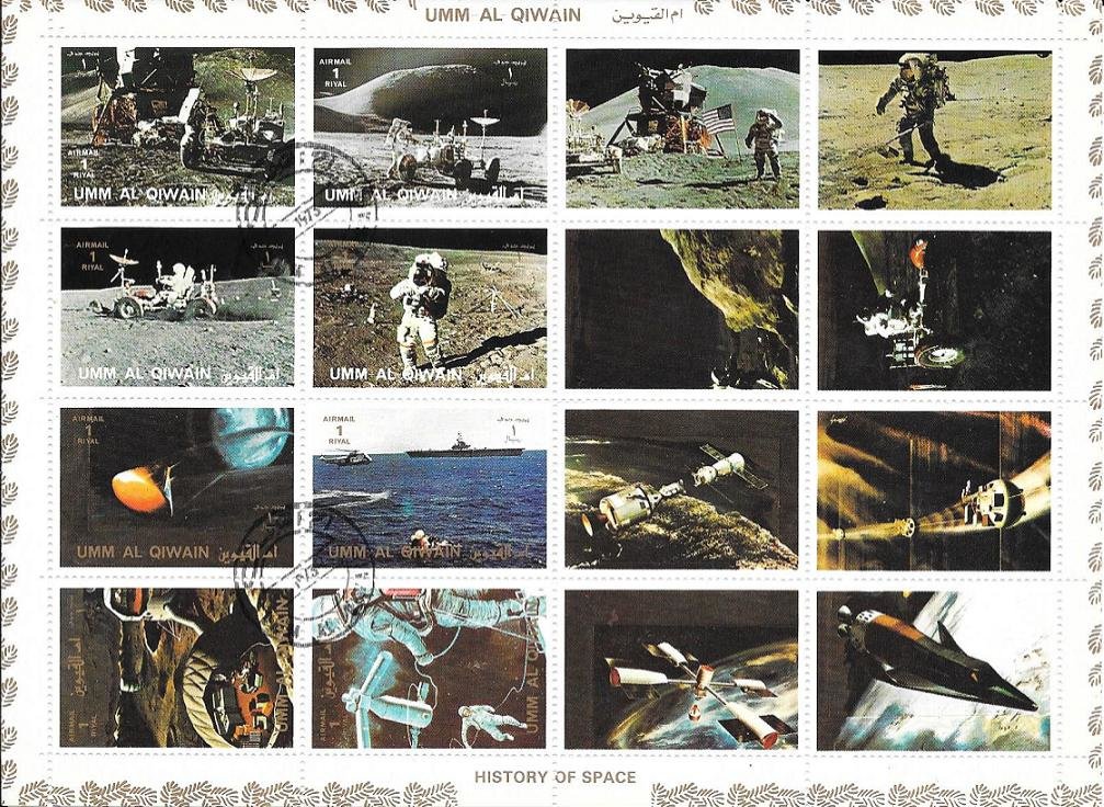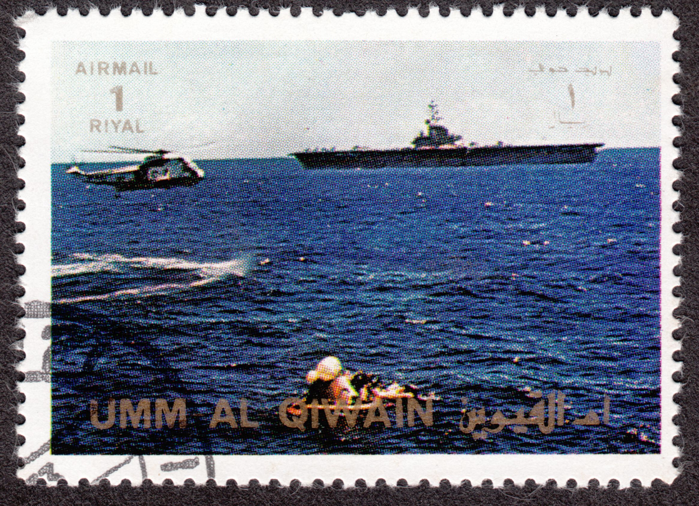 Dieses Postwertzeichen Umm al-Kaiwain MiNr. 1199 A zeigt als Motiv einen Flugzeugträger der US Navy bei der Wasserung einer Raumkapsel:
