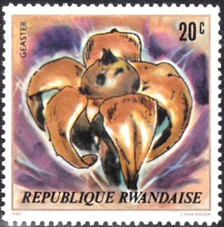 Auf dieser Marke aus Ruanda (MiNr 1051) wird ein Erdstern gezeigt. Die genaue Art ist weder auf der Marke noch im Michel angegeben.