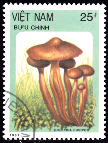 Hier kann ich eine Marke aus Vietnam (MiNr 1880) mit dem Spindeligen Rübling (Collybia fusipes) zeigen.