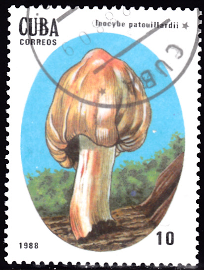 Diese Marke aus Kuba stellt uns den Ziegelroten Risspilz (Inosperma erubescens) vor.