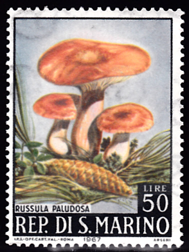 Auf dieser Marke aus San Marino (MiNr 895) sind Apfel-Täublinge (Russula paludosa) zu sehen.
