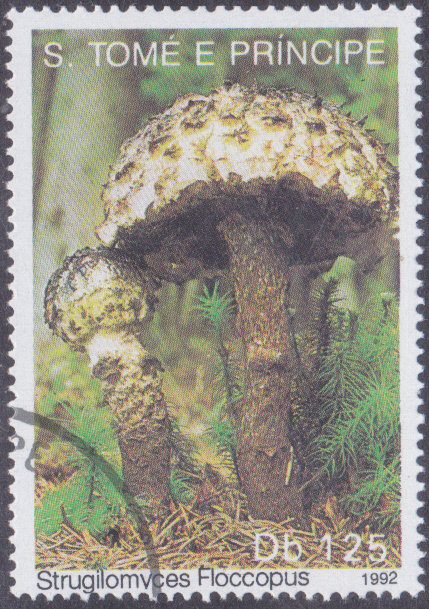 Diese Marke aus Sao Tomé und Principe (MiNr 1348) zeigt den Gemeine Strubbelkopfröhrling (Strobilomyces strobilaceus, syn.: Strobilomyces floccopus). Bei Michel wird der Name Flockenstieliger Strubbelkopfröhrling (Strobilomyces floccopus) genannt.