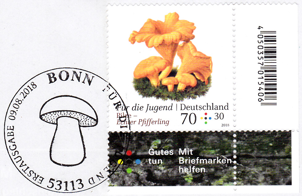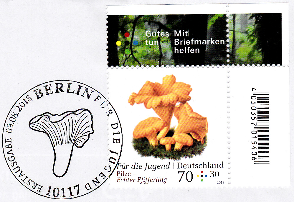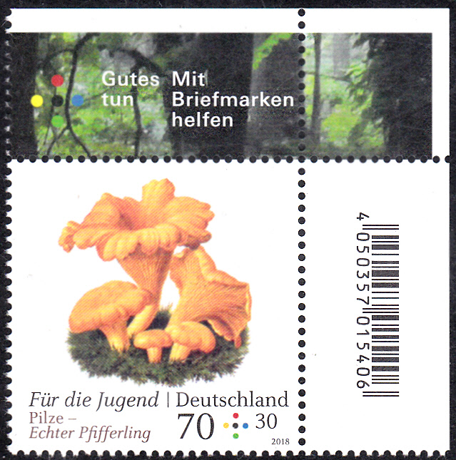 In der Serie "Für die Jugend" 2018 erschien auch eine Marke (MiNr 3407) mit dem Echten Pfifferling (Cantharellus cibarius). Hier ein Eckrandstück mit EAN-Code: