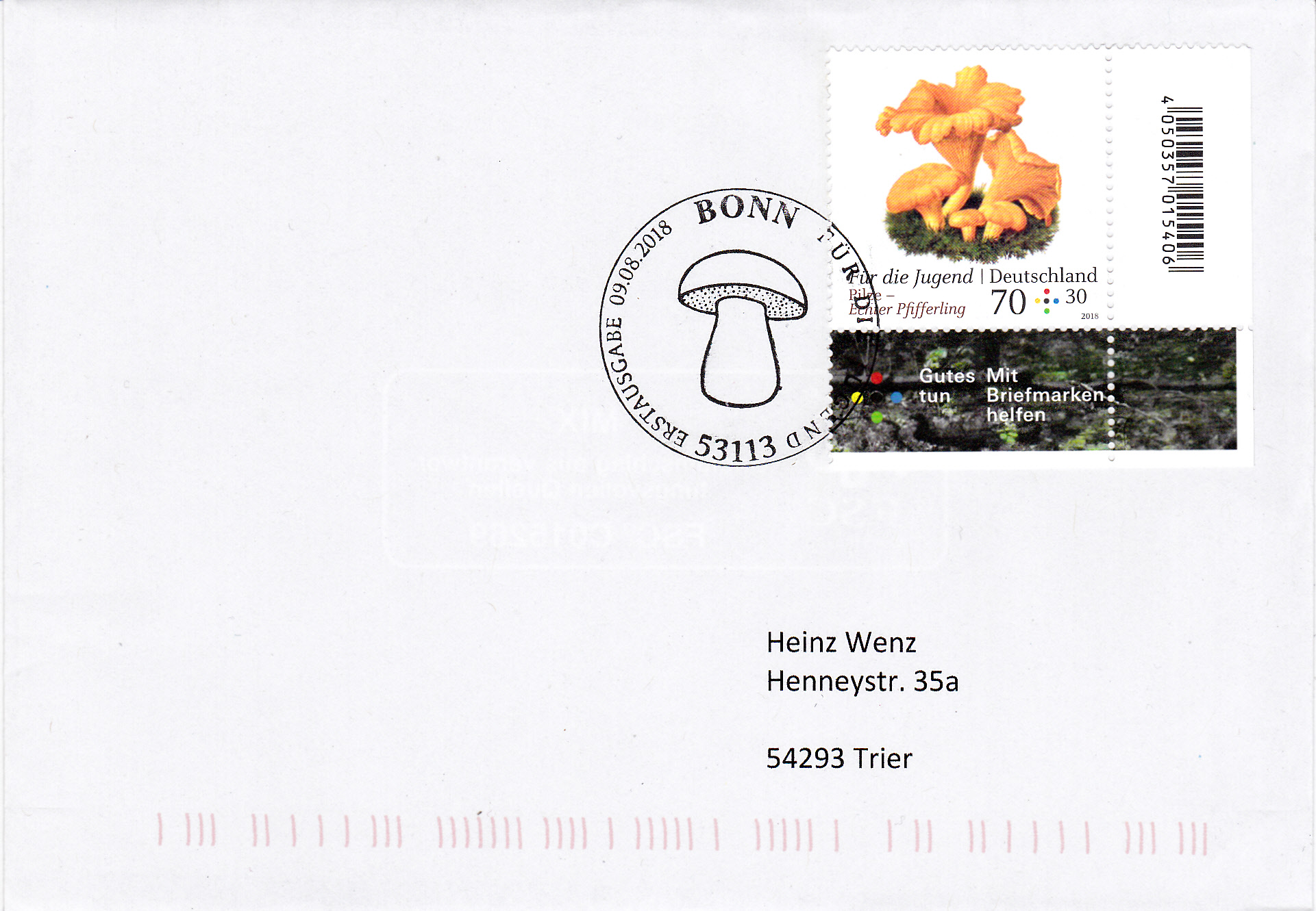Die Marke auf diesem Brief ist mit dem Ersttagsonderstempel Bonn gestempelt. Im Stempelbild wird passend zur 85+40 Cent-Marke ein Steinpilz abgebildet.