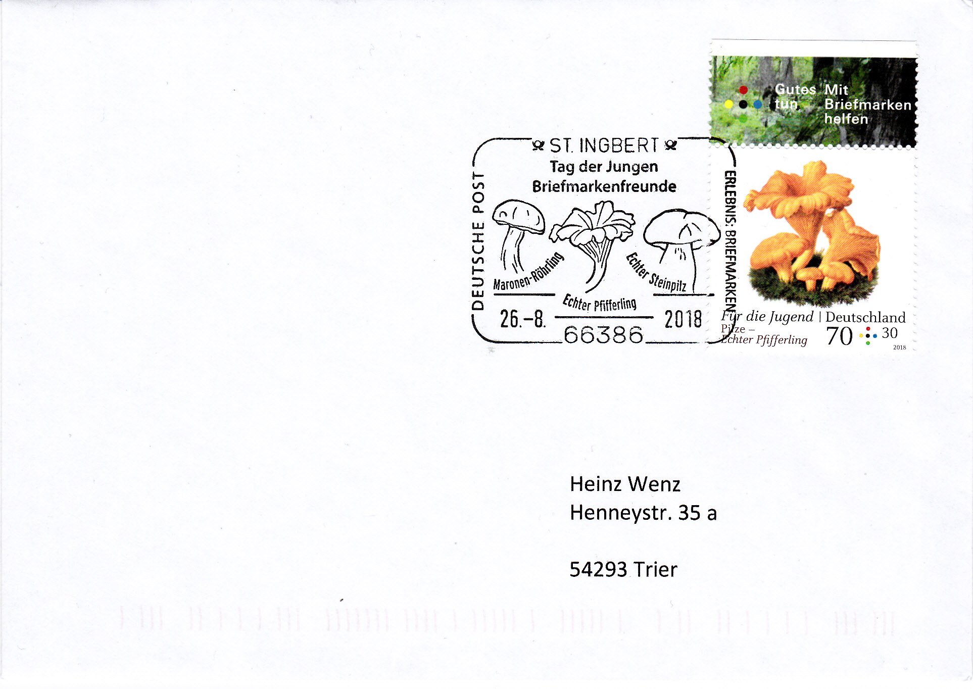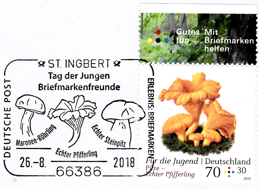 Im Sonderstempel aus St. Ingbert vom 26.08.2018 zum "Tag der Jungen Briefmarkenfreunde" 2018 erscheint der Echter Pfifferling auch im Stempelbild (Mitte).