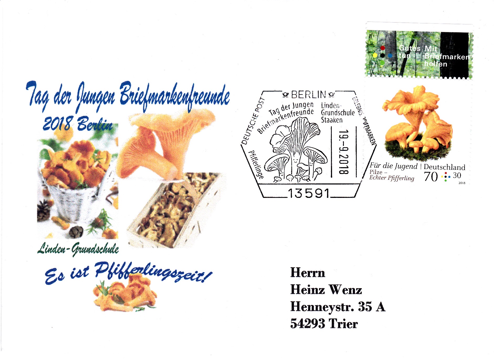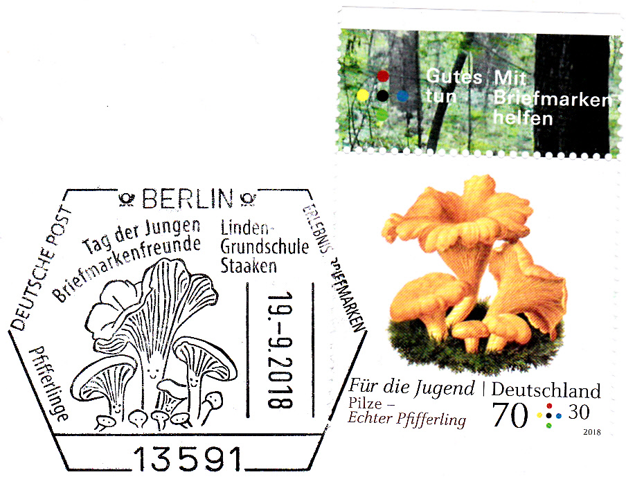 Im Sonderstempel aus Berlin vom 19.09.2018 zum "Tag der Jungen Briefmarkenfreunde" 2018 werden Echte Pfifferlinge auch im Stempelbild gezeigt.