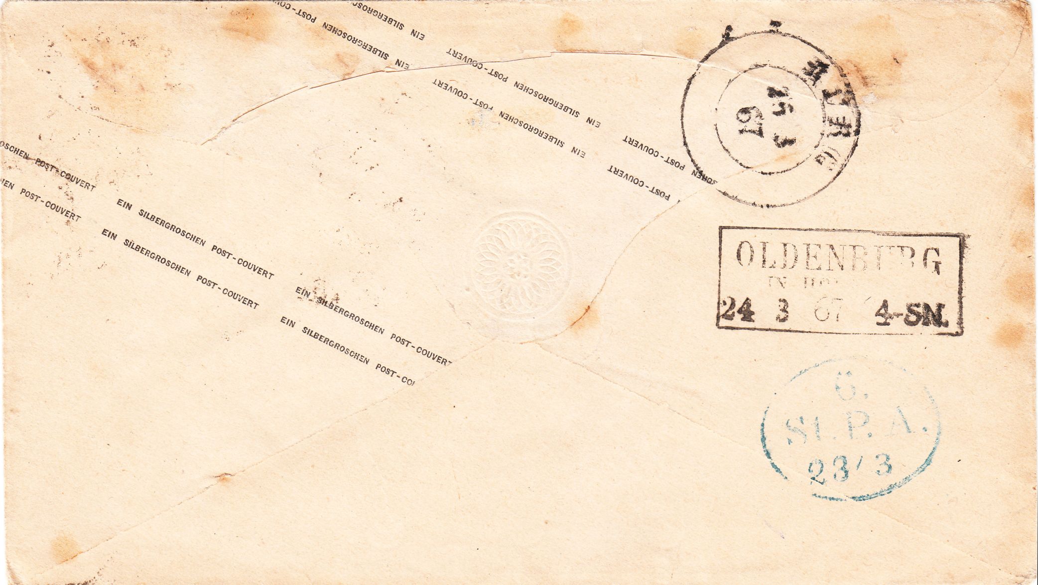 Rückseitig finden sich ein schwarzer Rahmenstempel vom 24.03.1867 aus "OLDENBURG IN HOLSTEIN" als Durchgangsstempel sowie als Ausgabestempel ein schwarzer Zweikreisstempel vom 25.03.1867 aus "BURG".