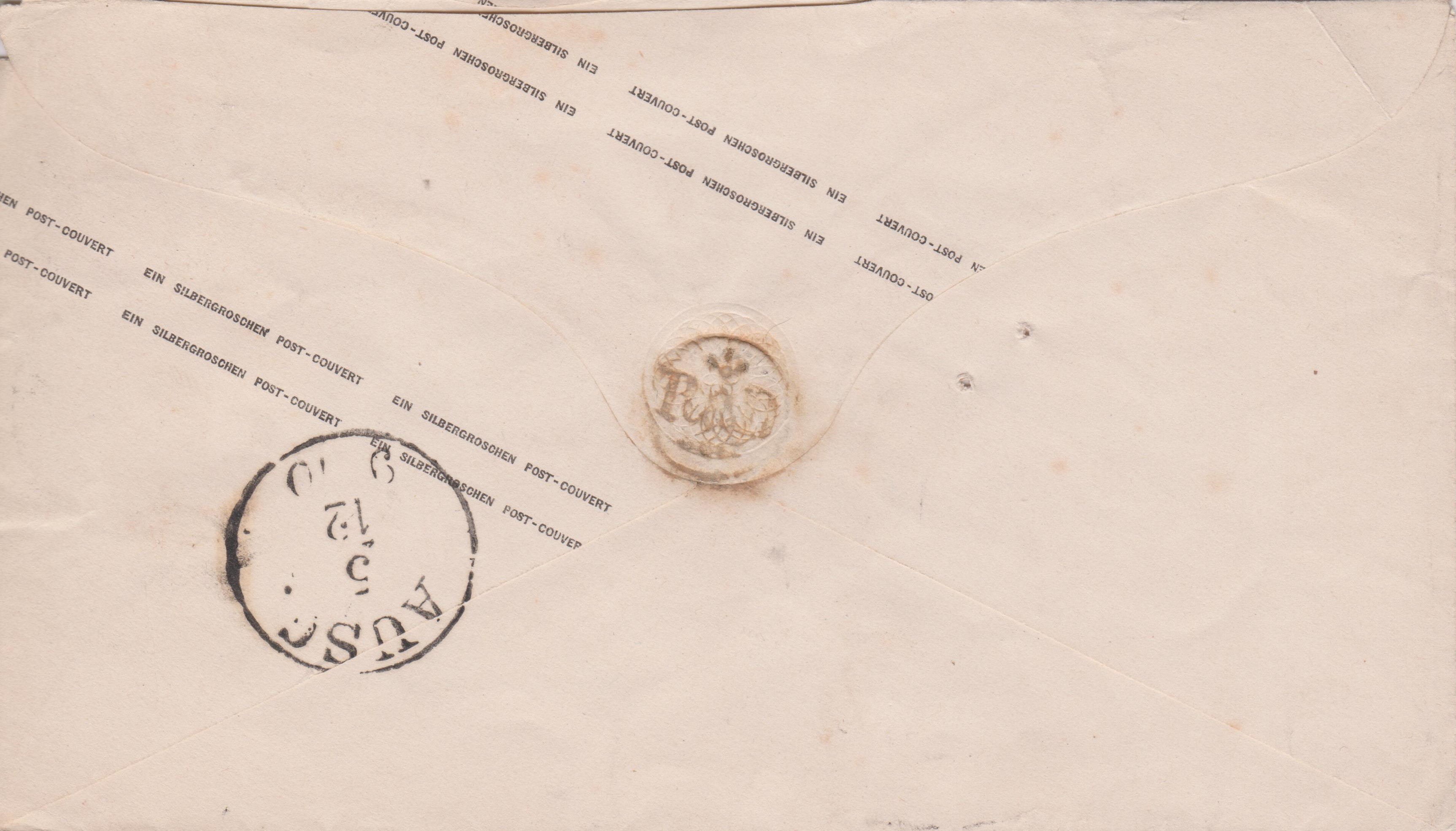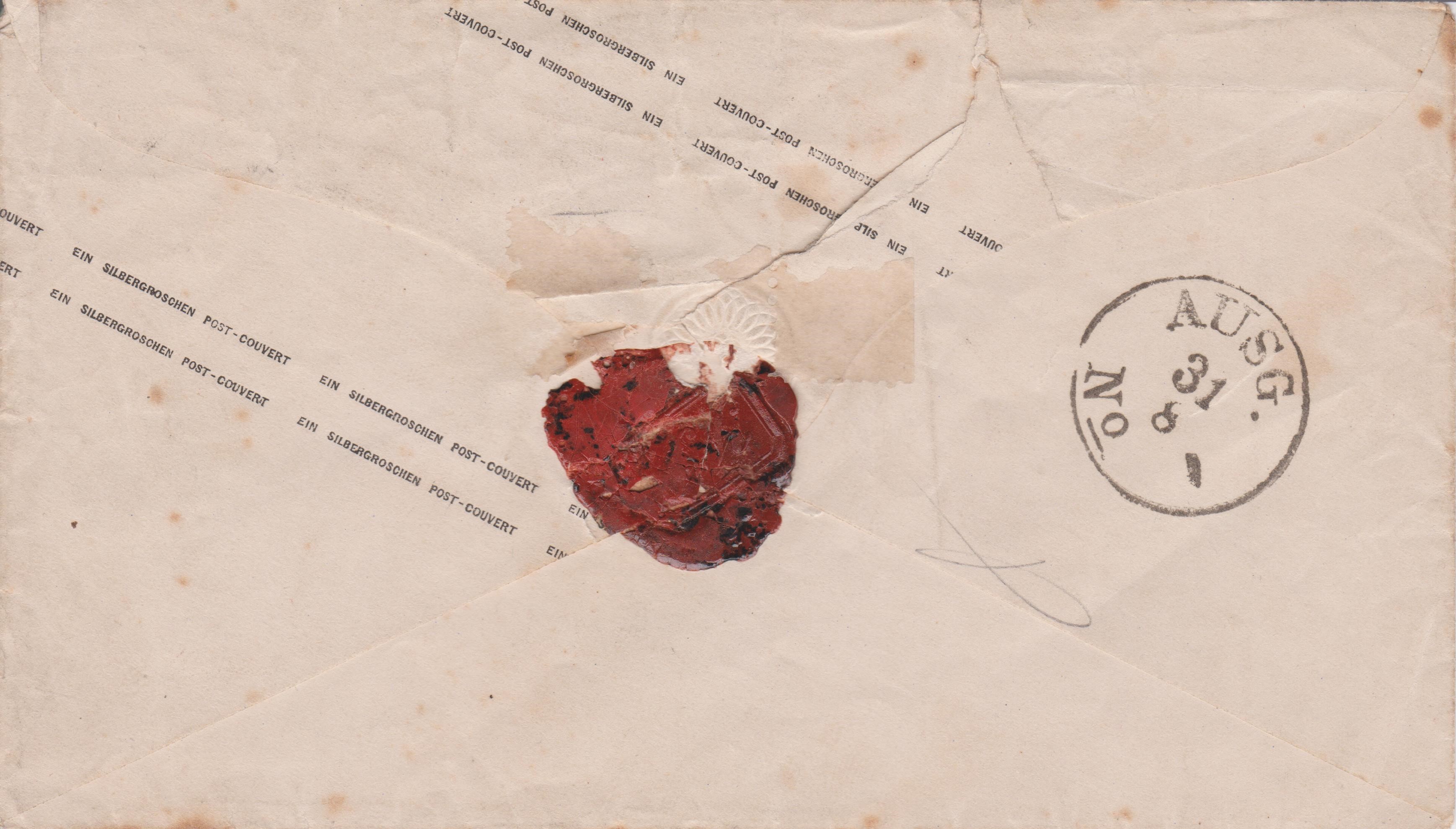 Dieses nach Burg auf Fehmarn adressierte Exemplar wurde relativ spät verwendet und erst zur Zeit des Norddeutschen Bundes am 23.03.1867 in Hamburg in einen Briefkasten eingeworfen.
