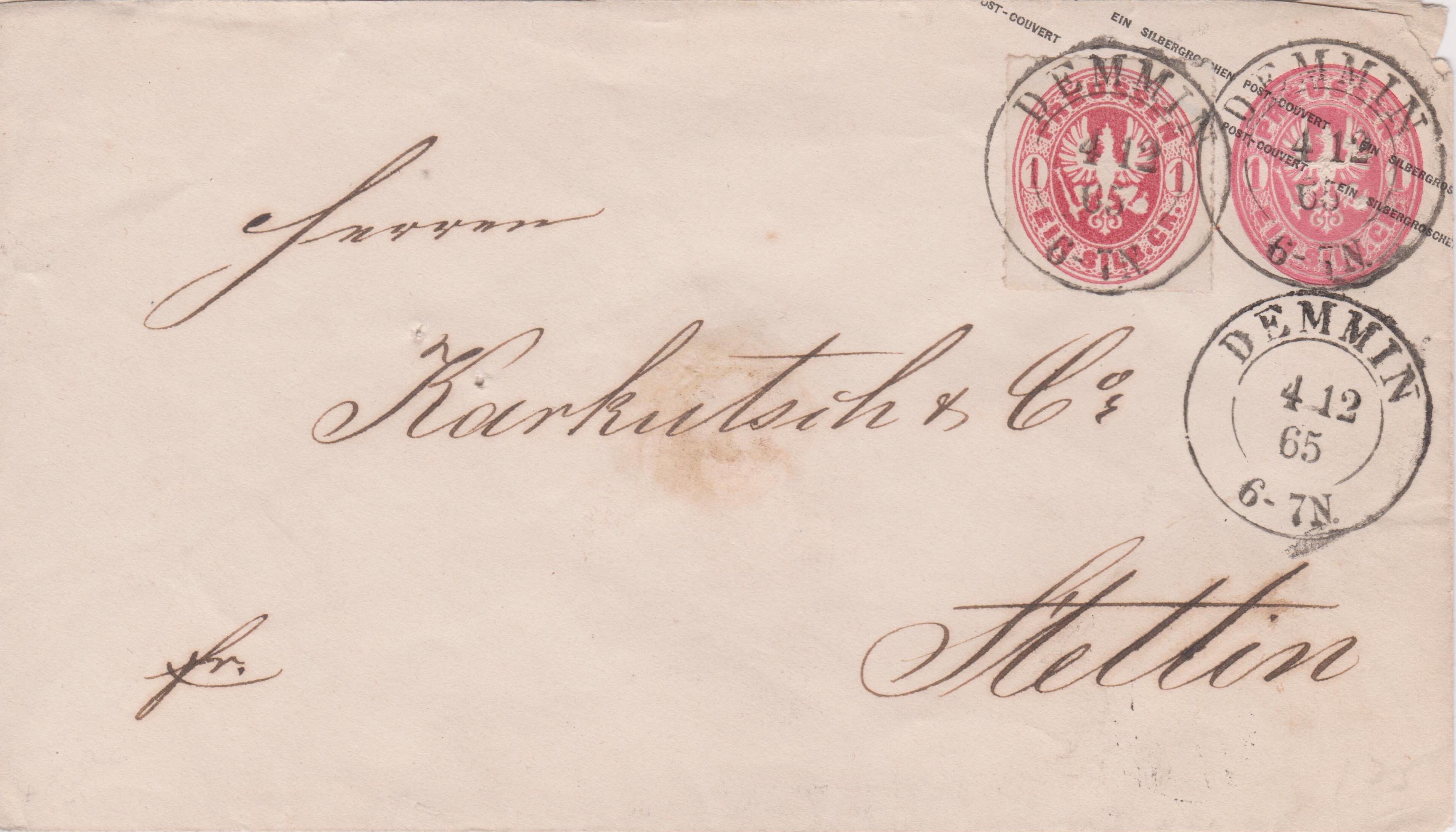 Preußen Ganzsache U 26 A mit bildgleicher Zusatzfrankatur Preußen MiNr. 16 a, aufgegeben in DEMMIN am 04.12.1865, angekommen in Stettin am 05.12.1865: