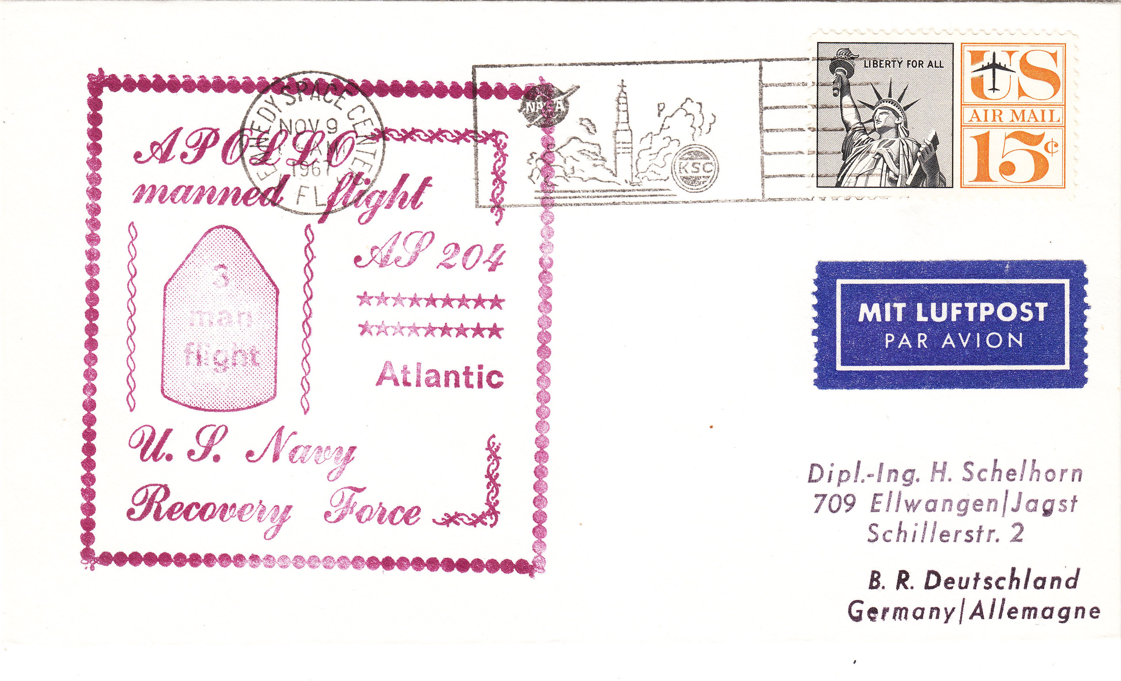 Die gesamte zu diesem Zweck eingelieferte Post wurde zentral zum KENNEDY SPACE CENTER geleitet und dort bis zur nächsten APOLLO-Mission gelagert, um dann am 09.11.1967 abgestempelt zu werden.