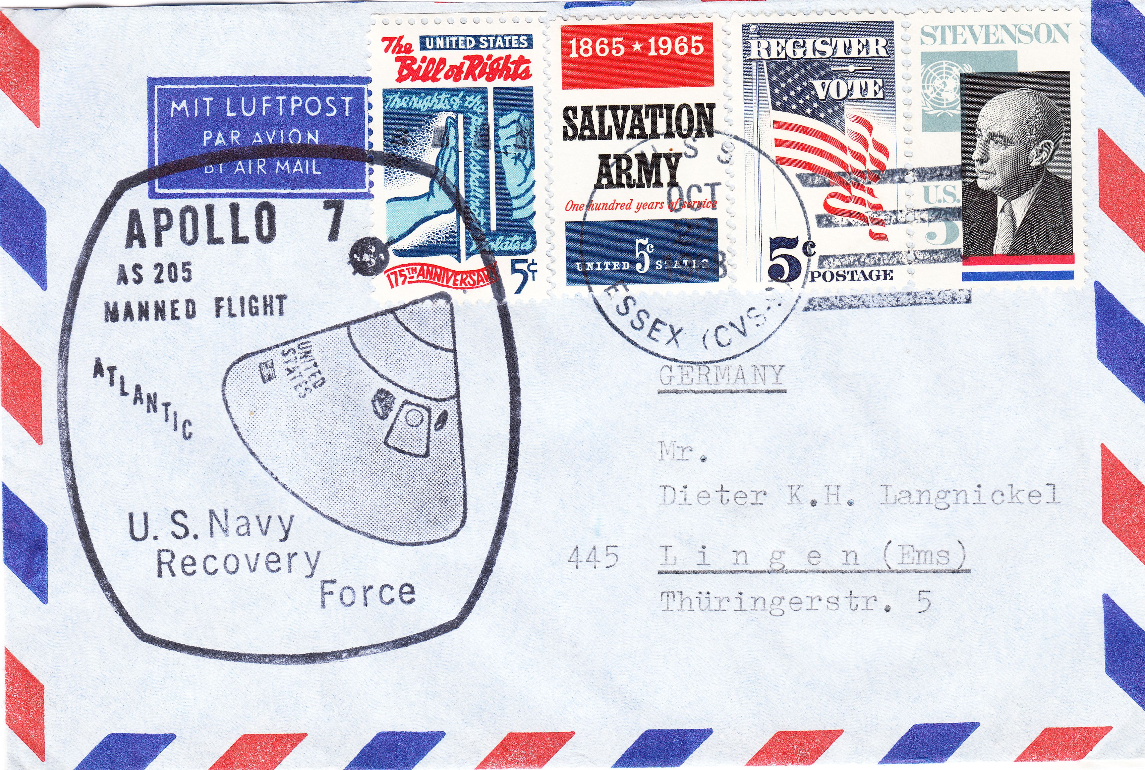 Am 22.10.1968 landete APOLLO 7 in der Karibik (27° 38′ N, 64° 9′ W). Die APOLLO-Landekapsel lag zuerst mit der Spitze nach unten im Wasser, konnte aber durch Aufblasen von Luftsäcken aufgerichtet werden. Die Astronauten wurden mit einem Hubschrauber an Bord der USS ESSEX (CVS-9) als dem Bergungsschiff diesr Missiom gebracht, was dieser Beleg dokumentiert: