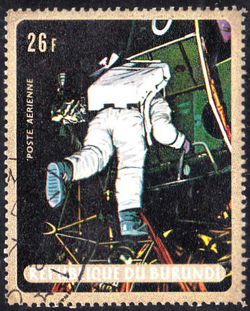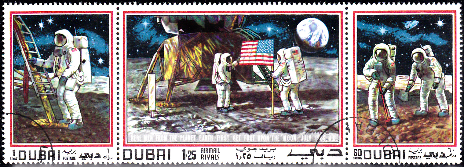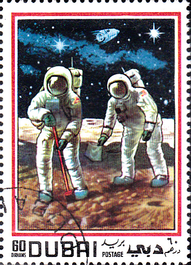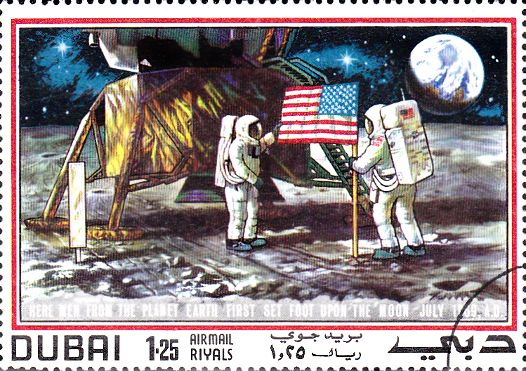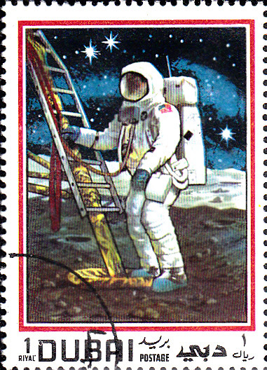 In Dubai gab es ebenfalls eine Markenausgabe zur ersten bemannten Mondlandung durch Apollo 11. Auf dieser Marke (MiNr 363) sehen wir einen Astronauten beim Verlassen der Mondfähre.