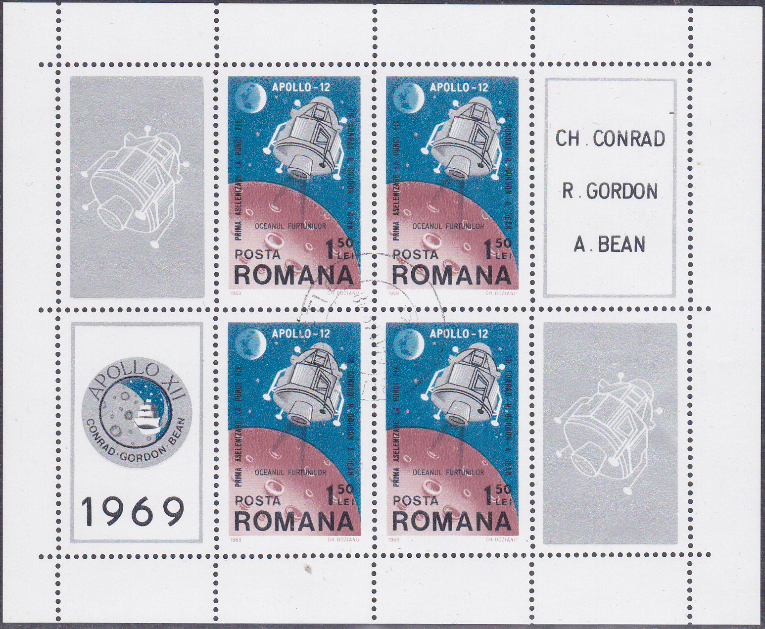 Aus Rumänien kommt diese Marke (MiNr 2809) zur Mondlandung von Apollo 12. Sie zeigt die Mondlandefähre von Apollo 12 und einen Teil der Mondfläche.