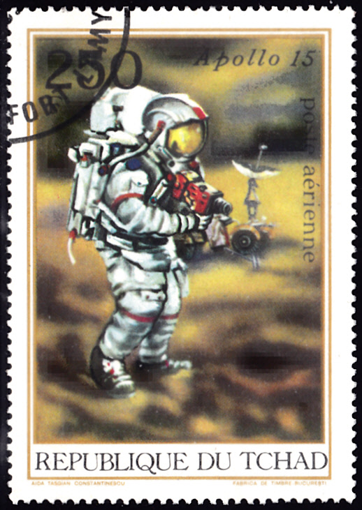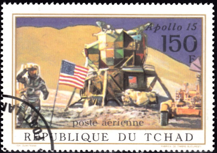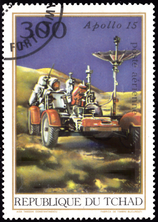 Auf einer weiteren Marke (MiNr 447) der Serie aus dem Tschad wird ein "Ausflug" mit dem Mondauto dargestellt.