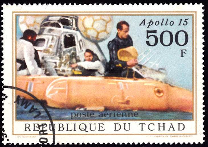 Eine weitere Marke der Serie (MiNr 448) mit zeigt die Rückkehr von Apollo 15 mit der Wasserung.