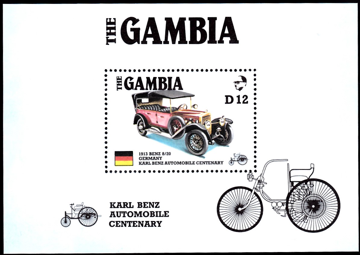 Auf der Marke (MiNr 635) in diesem Block (MiNr Block 25) aus Gambia zeigt einen Steiger Typ 10/50 Baujahr 1924 und nicht wie auf der Marke beschrieben Benz Typ 8/2Baujahr 1913.