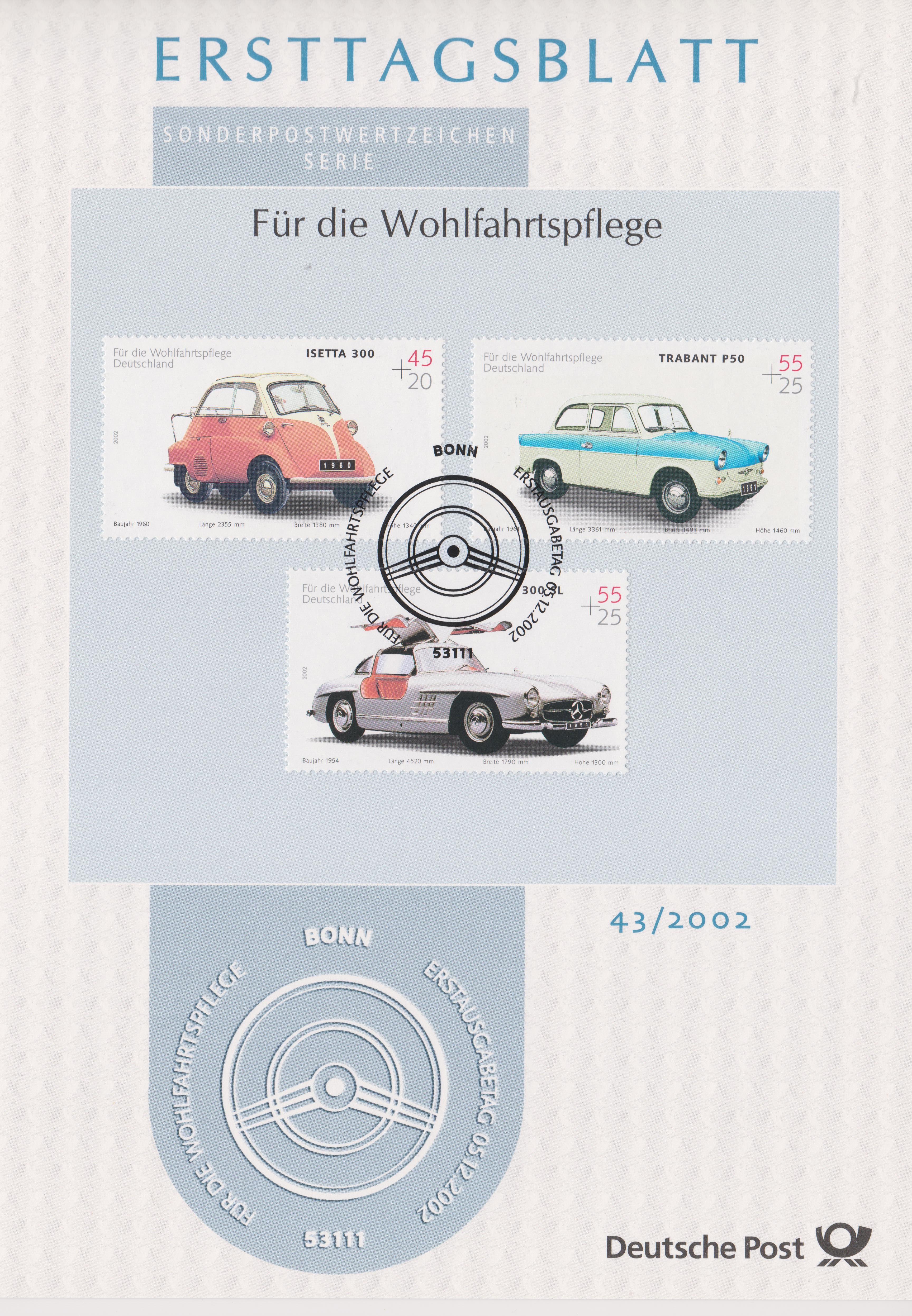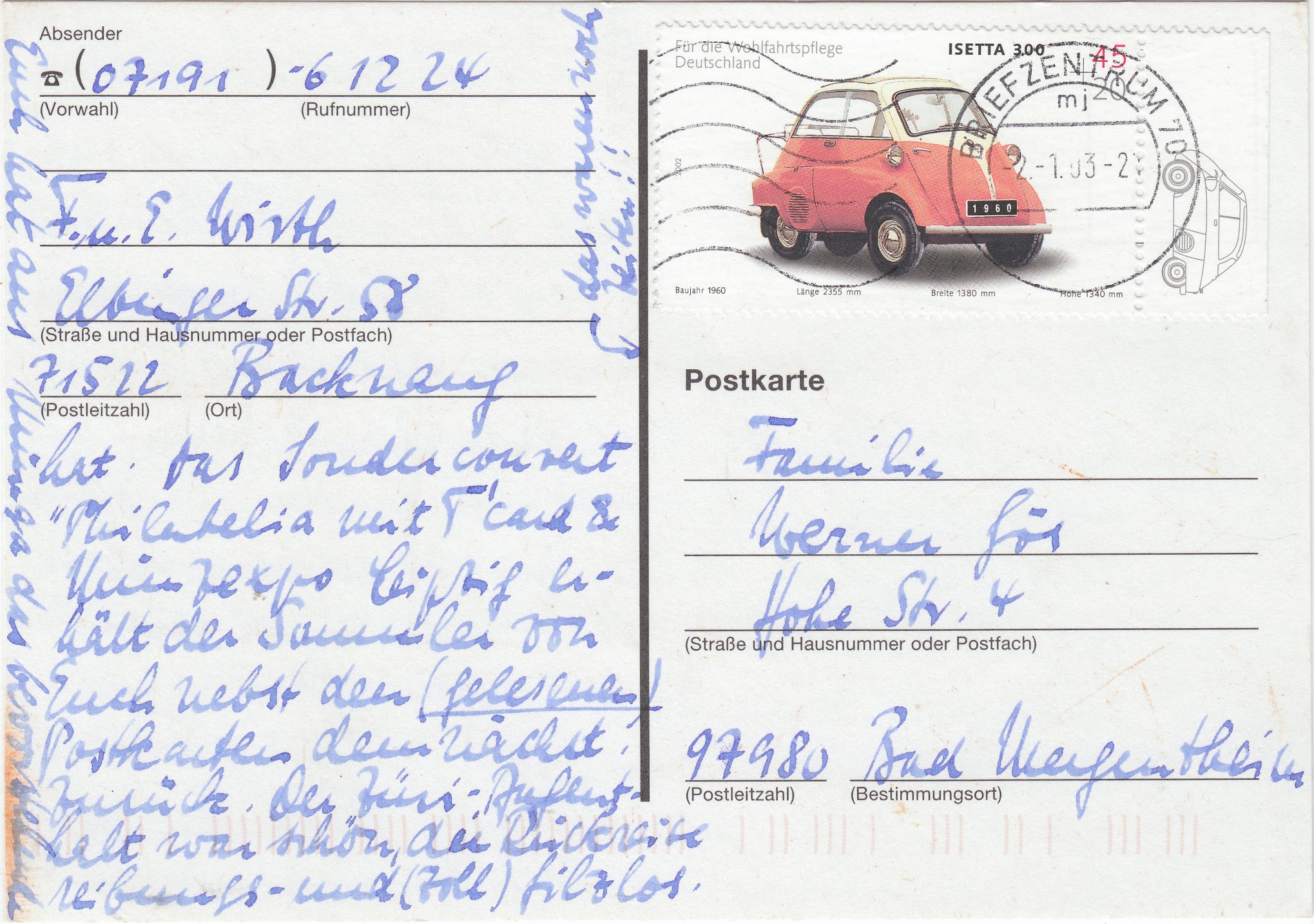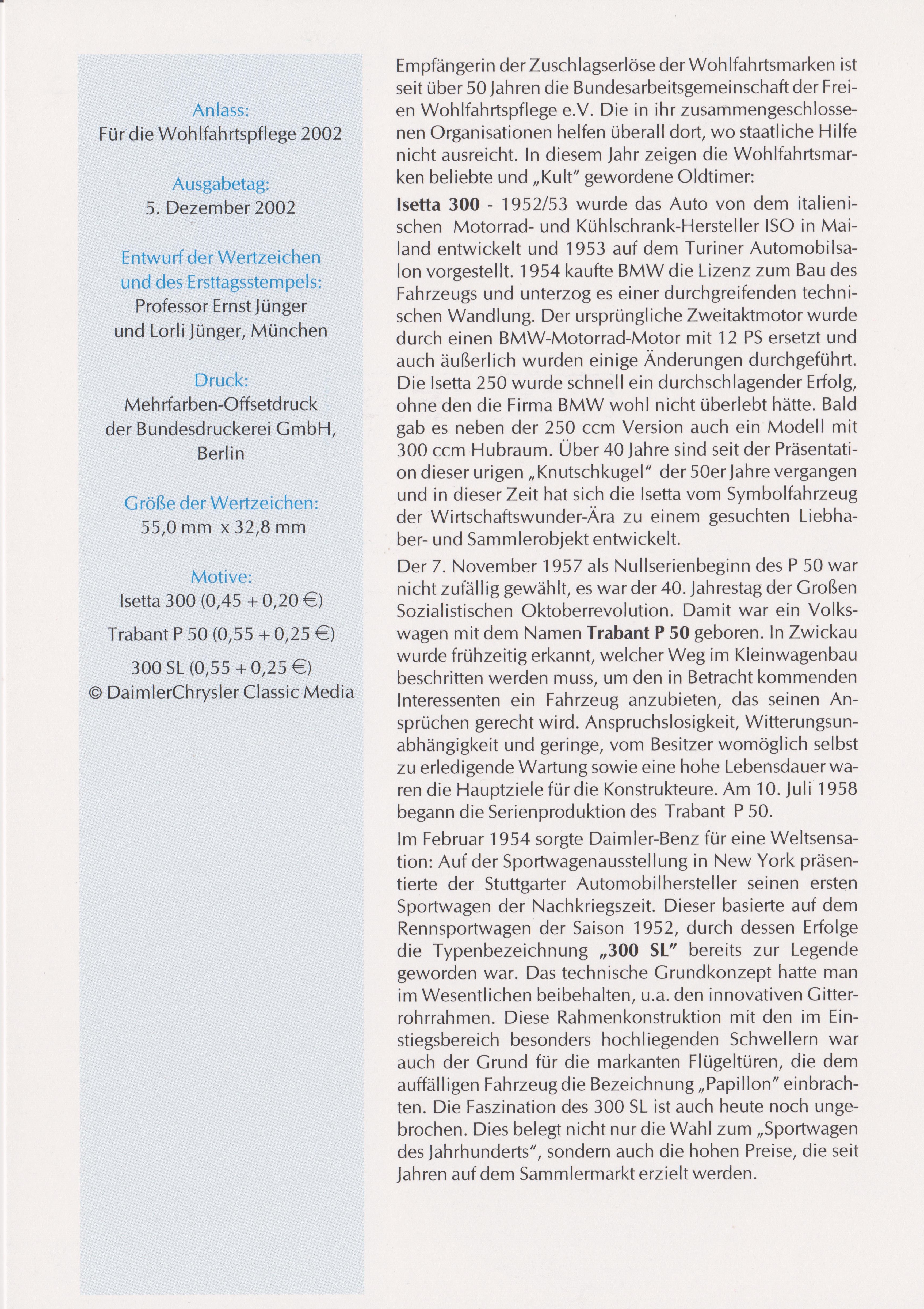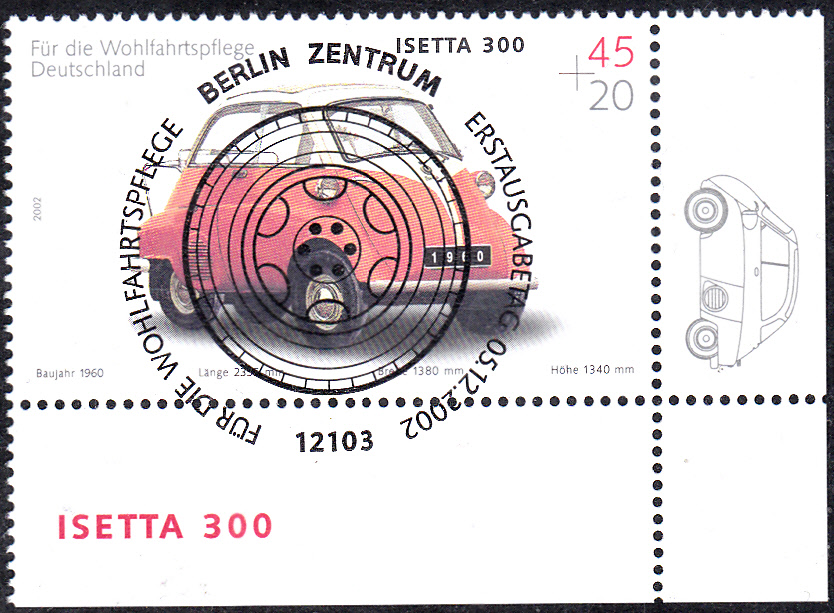 Die hier portogerecht als EF auf Postkarte verklebte Wohlfahrtsmarke erschien 2002 und zeigt eine BMW ISETTA 300, Baujahr 1960:
