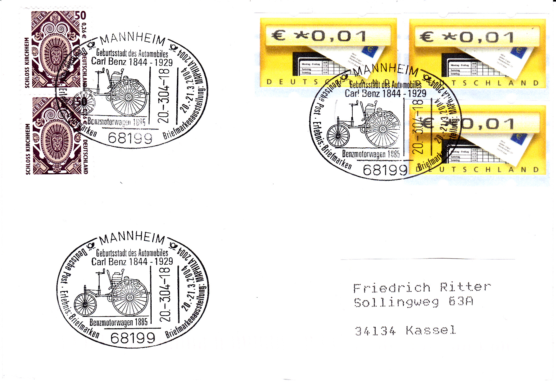 Sonderstempel aus Mannheim vom 20.3.2004 zum 160. Geburtstag von Carl Benz (1844 - 1929) mit Abbildung des Benz Motorwagen im Stempelbild.